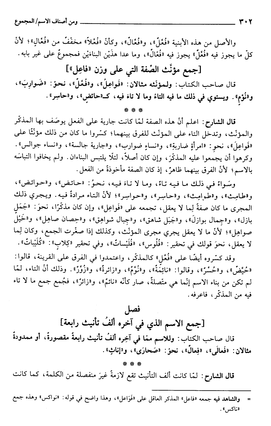قال صاحب الكتاب: ولمؤنثه مثالان فواعل وفعل نحو ضوارب ونوم ويستوي في ذلك ما فيه التاء وما لا تاء فيه كحائض وحاسر.