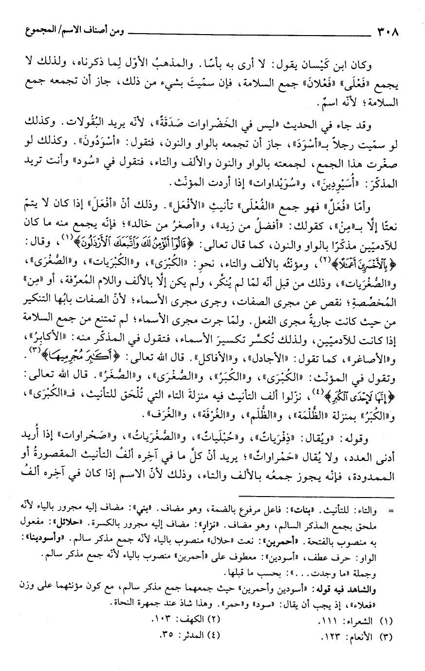 وقد جاء في الحديث "ليس في الخَضْراوات صَدَقَةٌ", لأنه يريد البُقُولات. وكذلك لو سميت رجلًا بـ"أسْوَدَ"، جاز أن تجمعه بالواو والنون، فتقول: "أسْوَدُونَ". وكذلك لو صغّرت هذا الجمع، لجمعته بالواو والنون والألف والتاء، فتقول في "سُود" وأنت تريد المذكرَ: "أُسَيْوِدِينَ"، و"سُوَيْداوات" إذا أردت المؤنّث.