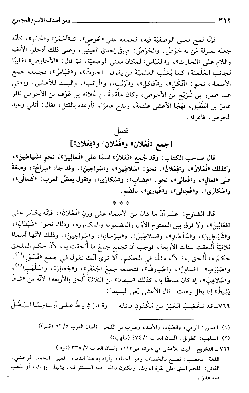 قال الشارح: اعلم أن ما كان من الأسماء على وزنِ "فَعْلانَ"، فإنه يكسّر على "فَعَالِينَ"، ولا فرق بين المفتوح الأول والمضمومه والمكسوره، وذلك نحو: "شَيْطان"، و"شَيَاطِينَ"، و"سُلطانِ"، و"سَلاطِينَ"، و"سِرْحانِ"، و"سَراحِينَ". وذلك لأنها أسماءٌ ثلاثيّة أُلحقت ببنات الأربعة، فوجب أن تجمع جمعَ ما أُلحقت به, لأنْ حكم الملحق حكمُ ما أُلحق به؛ لانه مثلُه في الحكم. ألا ترى أنك تقول في جمع "قَسْوَرِ" (¬1)، و"صَيرَفِ": "قَساوِرُ"، و"صَيارِفُ"، فتجمعه جمعَ "جَعْفَرِ"، و"جَعافِرَ"، و"سَلْهَبِ" (¬2)، و"سَلاهِبَ"، إذ كان ملحقًا به، كذلك "شيطان" من الثلاثيّة أُلحق بالأربعة؛ لأنه من "شاطَ يَشِيطُ" إذا بطل وهلك. قال الأعشى [من البسيط]: