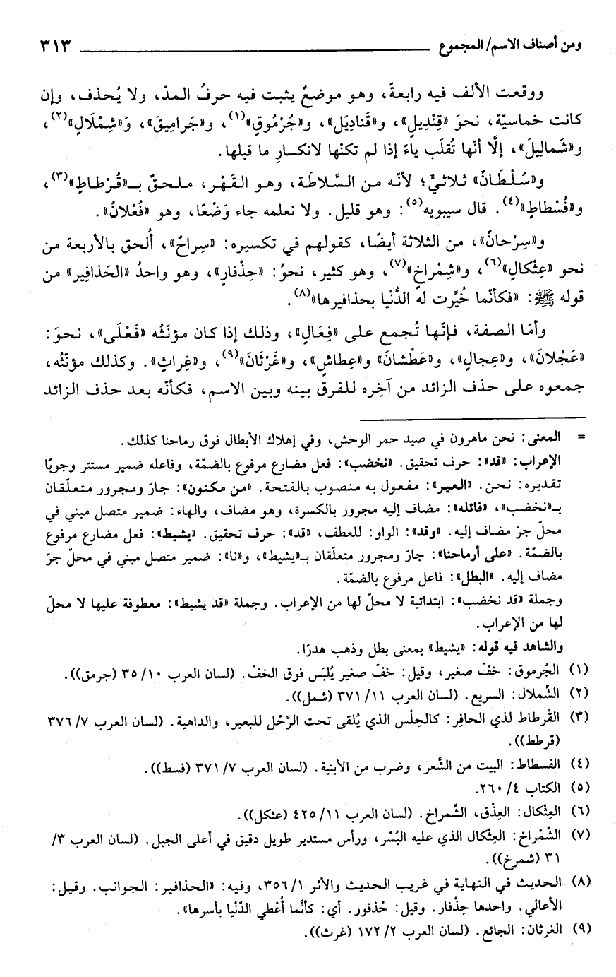 و"سِرْحان"، من الثلاثة أيضًا، كقولهم في تكسيره: "سِراحٌ"، أُلحق بالأربعة من نحو "عِثكالٍ" (¬6)، و"شِمْراخ" (¬7)، وهو كثير، نحوُ: "حِذْفار"، وهو واحدُ "الحَذافِير" من قوله - صلى الله عليه وسلم -: "فكأنما خُيِّرت له الدُّنْيا بحذافيرها" (¬8).