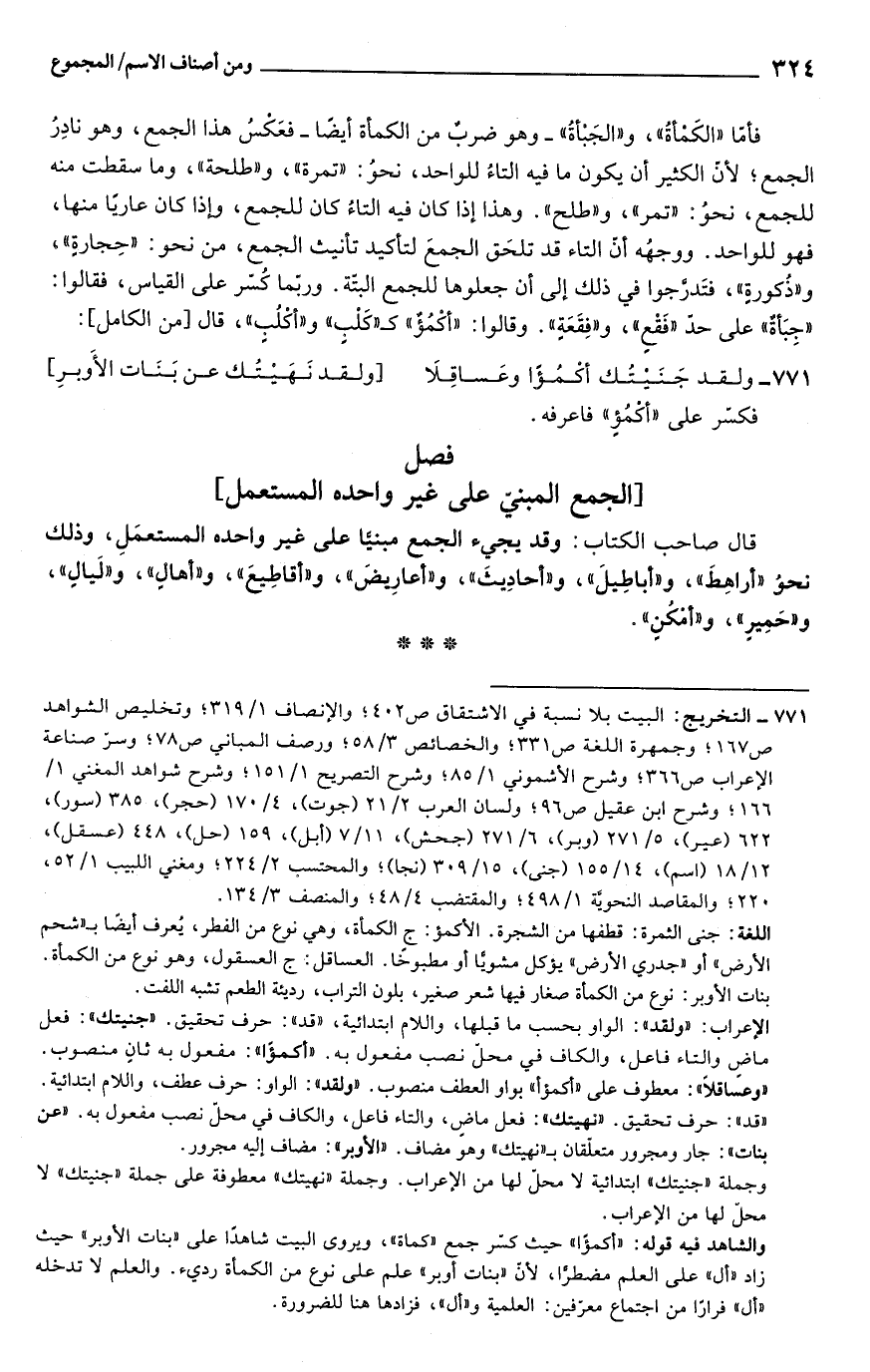 والشاهد فيه قوله: "أكمؤا" حيث كسر جمع "كماة"، ويروي البيت شاهدًا على "بنات الأوبر" حيث زاد "أل" على العلم مضطرًا, لأن "بنات أوبر" علم على نوع من الكمأة رديء. والعلم لا تدخله "أل" فرارًا من اجتماع معرّفين: العلمية و"أل"، فزادها هنا للضرورة.