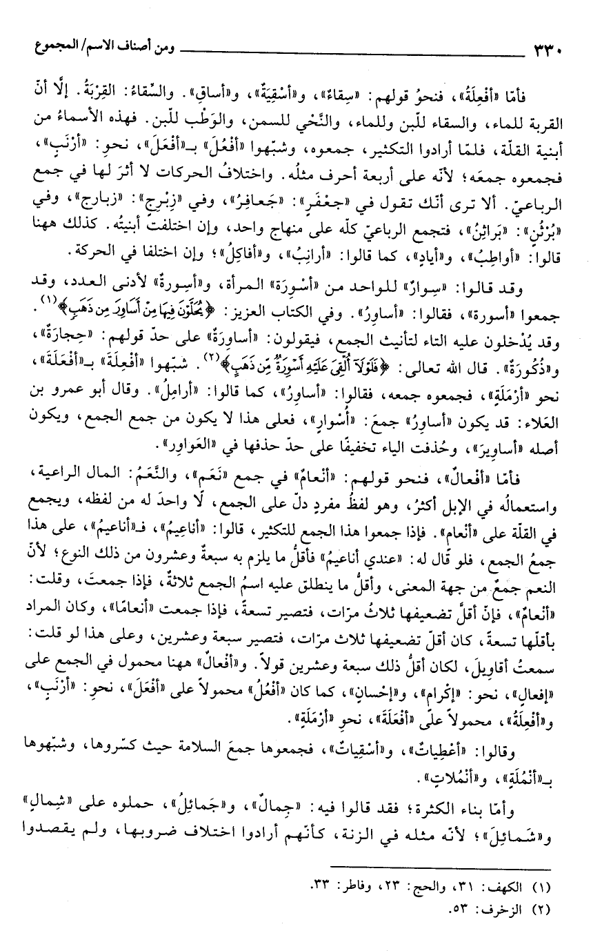 فأما "أفْعالٌ"، فنحو قولهم: "أنْعامٌ" في جمع "نَعَم"، والنعَمُ: المال الراعية، واستعمالُه في الإبل أكثرُ، وهو لفظُ مفرد دل على الجمع، لا واحدَ له من لفظه، ويجمع في القلة على "أنْعام". فإذا جمعوا هذا الجمع للتكثير، قالوا: "أناعِيمُ"، فـ "أناعيمُ"، على هذا جمعُ الجمع، فلو قال له: "عندي أناعيمُ" فأقل ما يلزم به سبعةٌ وعشرون من ذلك النوع؛ لأنّ النعم جمع من جهة المعنى، وأقل ما ينطلق عليه اسم الجمع ثلاثة، فإذا جمعتَ، وقلت: "أنْعام"، فإن أقل تضعيفها ثلاثُ مرّات، فتصير تسعة، فإذا جمعت "أنعامًا"، وكان المراد باقلها تسعة، كان أقل تضعيفها ثلاث مرَّات، فتصير سبعة وعشرين، وعلى هذا لو قلت: سمعت أقاوِيلَ، لكان أقل ذلك سبعة وعشرين قولًا. و"أفْعال" ها هنا محمول في الجمع على "إفعالٍ"، نحو: "إكْرام "، و"إحْسانٍ"، كما كان "أفْعُلُ" محمولًا على "أفْعَلَ"، نحوِ: "أرْنَبٍ"، و"أفعِلَةُ"، محمولاً على "أفْعَلَةَ"، نحوِ "أرمَلَة".