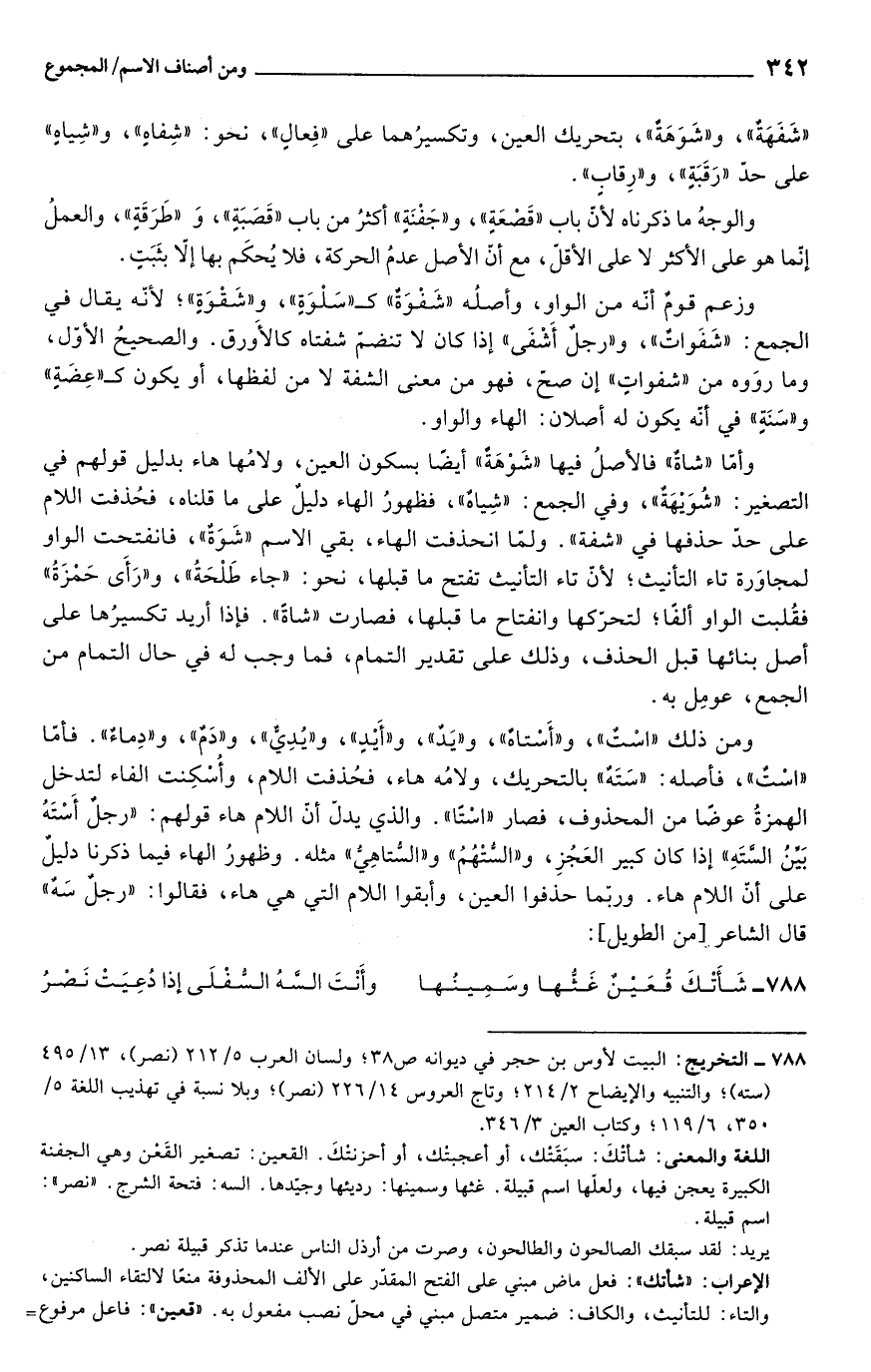 "شَفَهَةٌ"، و"شَوَهَةٌ"، بتحريك العين، وتكسيرُهما على "فِعالٍ"، نحو: "شِفاهٍ"، و"شِياهٍ" على حد "رَقَبَةٍ"، و"رِقابٍ".