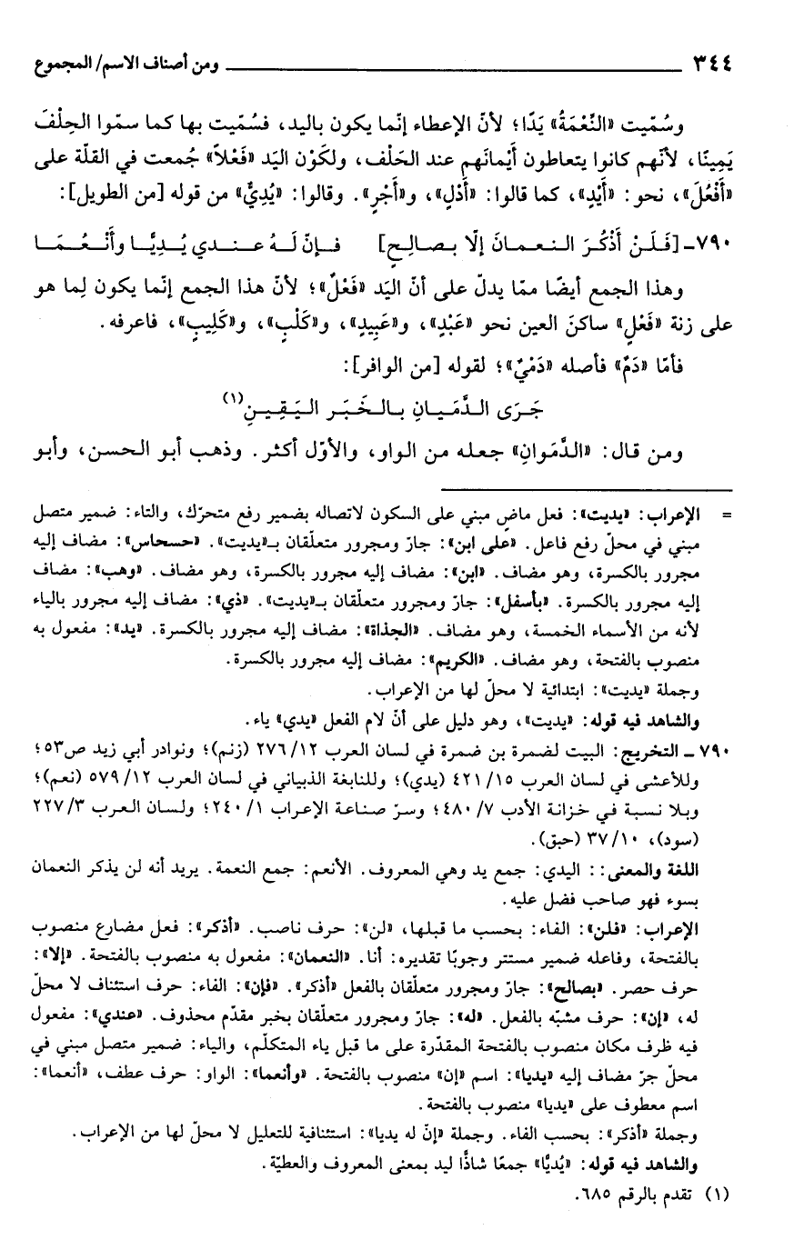 وهذا الجمع أيضًا ممّا يدلّ على أنّ اليَد "فَعْلٌ"؛ لأنّ هذا الجمع إنّما يكون لِما هو على زنة "فَعْلٍ" ساكنَ العين نحو "عَبدٍ"، و"عَبِيدٍ"، و"كَلْبٍ"، و"كَلِيبٍ"، فاعرفه.