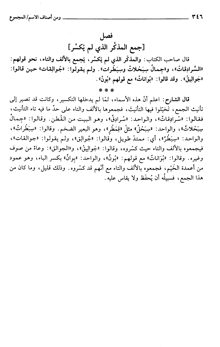 قال الشارح: اعلم أن هذه الأسماء، لمّا لم يدخلها التكسير، وكانت قد تصير إلى تأنيث الجمع، تَخيلوا فيها التأنيثَ، فجمعوها بالألف والتاء على حدِّ ما فيه تاء التأنيث، فقالوا: "سُرادِقاتٌ"، والواحد: "سُرادِقٌ"، وهو البيت من القُطن. وقالوا: "جِمالٌ سِبَحْلاتٌ"، والواحد: "سِبَحْلٌ" مثلُ "قِمَطْرٍ"، وهو البعير الضخم. وقالوا: "سِبَطْراتٌ"، والواحد: "سِبَطْرٌ"، أي: ممتدّ طويل، وقالوا: "جُوالِق"، ولم يقولوا: "جوالقات"، فيجمعوه بالألف والتاء حيث كسروه، وقالوا: "جَوالِيقُ"، و"الجوالق": وعاءٌ من صوف وغيره. وقالوا: "بُوَاناتٌ" مع قولهم: "بُونٌ"، والواحد: "بِوانٌ" بكسر الباء، وهو عمود من أعمدة الخَيْم، فجمعوه بالألف والتاء مع أنّهم قد كسّروه. وذلك قليل، وما كان من هذا الجمع، فسبيلُه أن يُحفَظ ولا يقاس عليه.