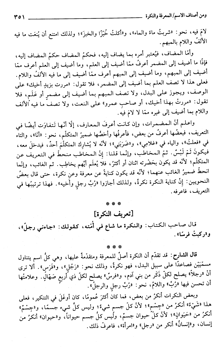 قال الشارح: قد تقدّم أن النكرة أصلٌ للمعرفة ومتقدّمةٌ عليها، وهي كلُّ اسم يتناول مسمّيَيْن فصاعدًا على سبيل البدل، فهو نكرةٌ، وذلك نحو: "رَجُلٍ"، و"فَرَسٍ". ألا ترى أنّ "رجلاً" يصلح لكلّ ذَكَر من بني آدم، و"فرسٌ" يصلح لكلّ ذي أربعٍ صَهالٍ. وعلامتُها أن تحسن فيها "رُبَّ" واللامُ، نحو: "رُبَّ رجلٍ والرجلُ".