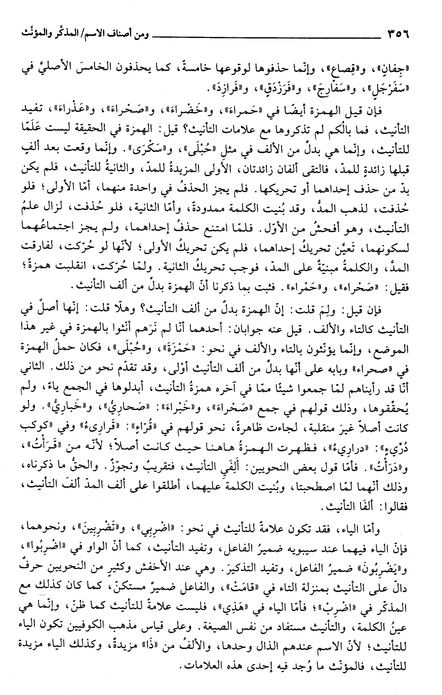 فإن قيل الهمزة أيضًا في "حَمراءَ"، و"خَضْراءَ"، و"صَحْراءَ"، و"عَذْراءَ"، تفيد التأنيث، فما بالُكم لم تذكروها مع علامات التأنيث؟ قيل: الهمزة في الحقيقة ليست عَلَمًا للتأنيث، وإنّما هي بدلٌ من الألف في مثل "حُبْلَى"، و"سَكْرَى". وإنّما وقعت بعد ألفٍ قبلها زائدةٍ للمدّ، فالتقى ألفان زائدتان، الأَولى المزيدةُ للمدّ، والثانيةُ للتأنيث، فلم يكن بدّ من حذف إحداهما أو تحريكها. فلم يجز الحذفُ في واحدة منهما، أمّا الأولى؛ فلو حُذفت، لذهب المدُّ، وقد بُنيت الكلمة ممدودةً، وأمّا الثانية، فلو حُذفت، لزال علمُ التأنيث، وهو أفحشُ من الأوّل. فلمّا امتنع حذفُ إحداهما، ولم يجز اجتماعُهما لسكونهما، تَعيَّن تحريكُ إحداهما، فلم يكن تحريكُ الأولى؛ لأنّها لو حُرّكت، لفارقت المدَّ، والكلمةُ مبنيّةٌ على المدّ، فوجب تحريكُ الثانية. ولمّا حُرّكت، انقلبت همزةً؛ فقيل: "صَحْراء"، و"حَمْراء". فثبت بما ذكرنا أن الهمزة بدلٌ من ألف التأنيث.