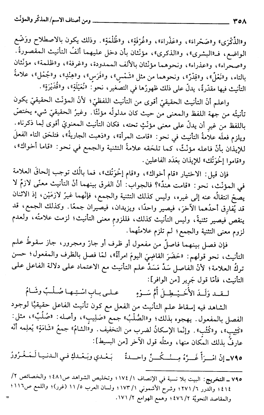 واعلم أنّ التأنيث الحقيقىّ أقوى من التأنيث اللفظيّ؛ لأنّ المؤنّث الحقيقيّ يكون تأنيثُه من جهة اللفظ والمعنى من حيث كان مدلولُه مؤنّثًا. وغيرُ الحقيقيّ شيء يختصّ باللفظ من غيرِ أن يدلّ على معنى مؤنّث تحته، فكان التأنيث المعنويّ أقوى لِما ذكرناه. ويلزم فعلَه علامةُ التأنيث في نحو: "قامت المرأة"، و"ذهبت الجاريةُ"، فتلحَق التاء الفعلَ للإيذان بأنّ فاعله مؤنّثٌ، كما تلحَقه علامةُ التثنية والجمع في نحو: "قاما أخواك"، و"قاموا إخوَتُك" للإيذان بعَدَد الفاعلين.
