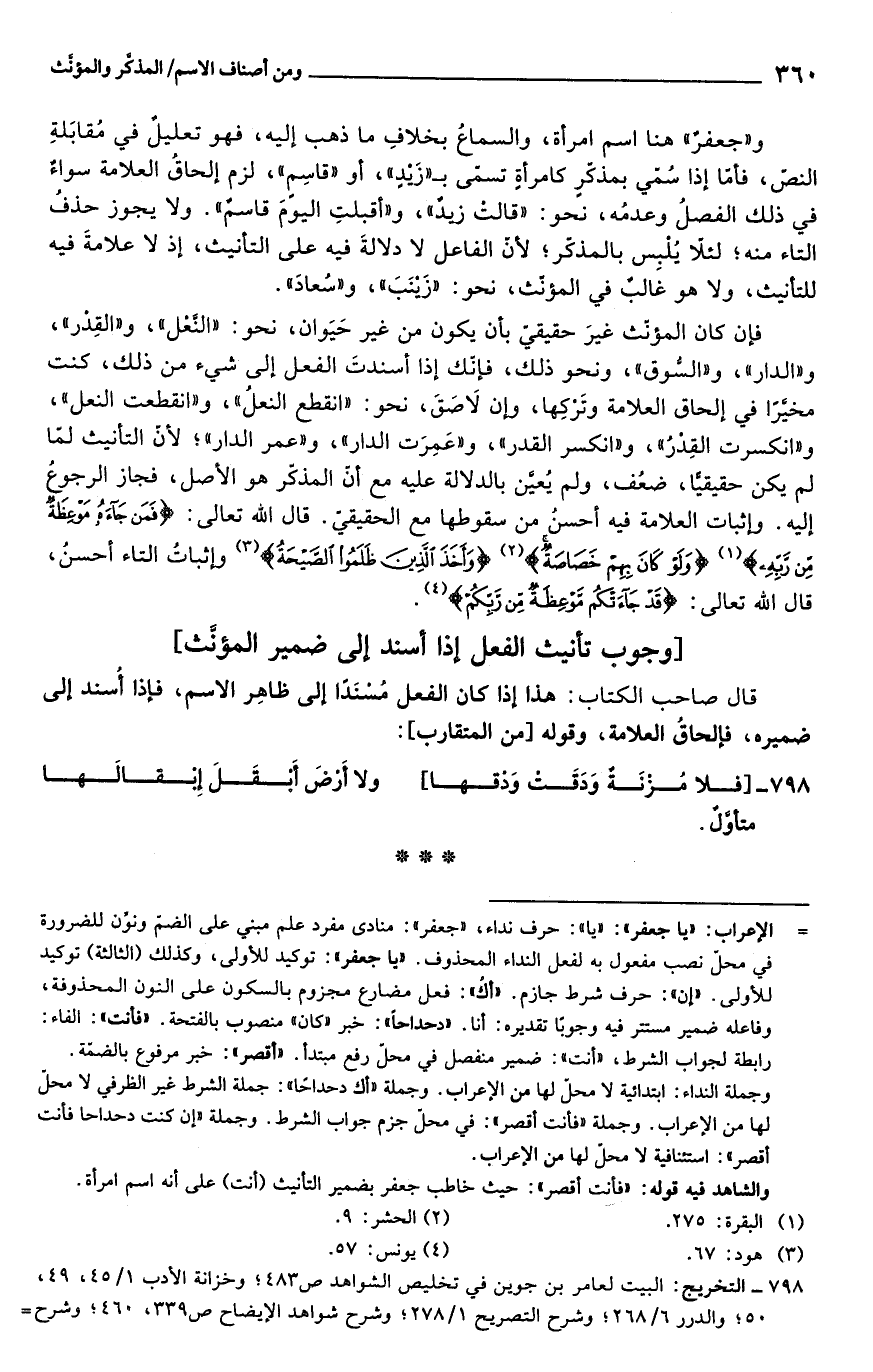 و"جعفرٌ" هنا اسم امرأة، والسماعُ بخلافِ ما ذهب إليه، فهو تعليلٌ في مُقابَلةِ النصّ، فأمّا إذا سُمّي بمذكّرٍ كامرأةٍ تسمّى بـ "زَيدٍ"، أو "قاسِمٍ"، لزم إلحاقُ العلامة سواءٌ في ذلك الفصلُ وعدمُه، نحو: "قالت زيدٌ"، و"أقبلتِ اليومَ قاسمٌ". ولا يجوز حذفُ التاء منه؛ لئلاّ يُلْبِس بالمذكّر؛ لأنّ الفاعل لا دلالةَ فيه على التأنيث، إذ لا علامةَ فيه للتأنيث، ولا هو غالبٌ في المؤنّث، نحو: "زَينَبَ"، و"سُعادَ".