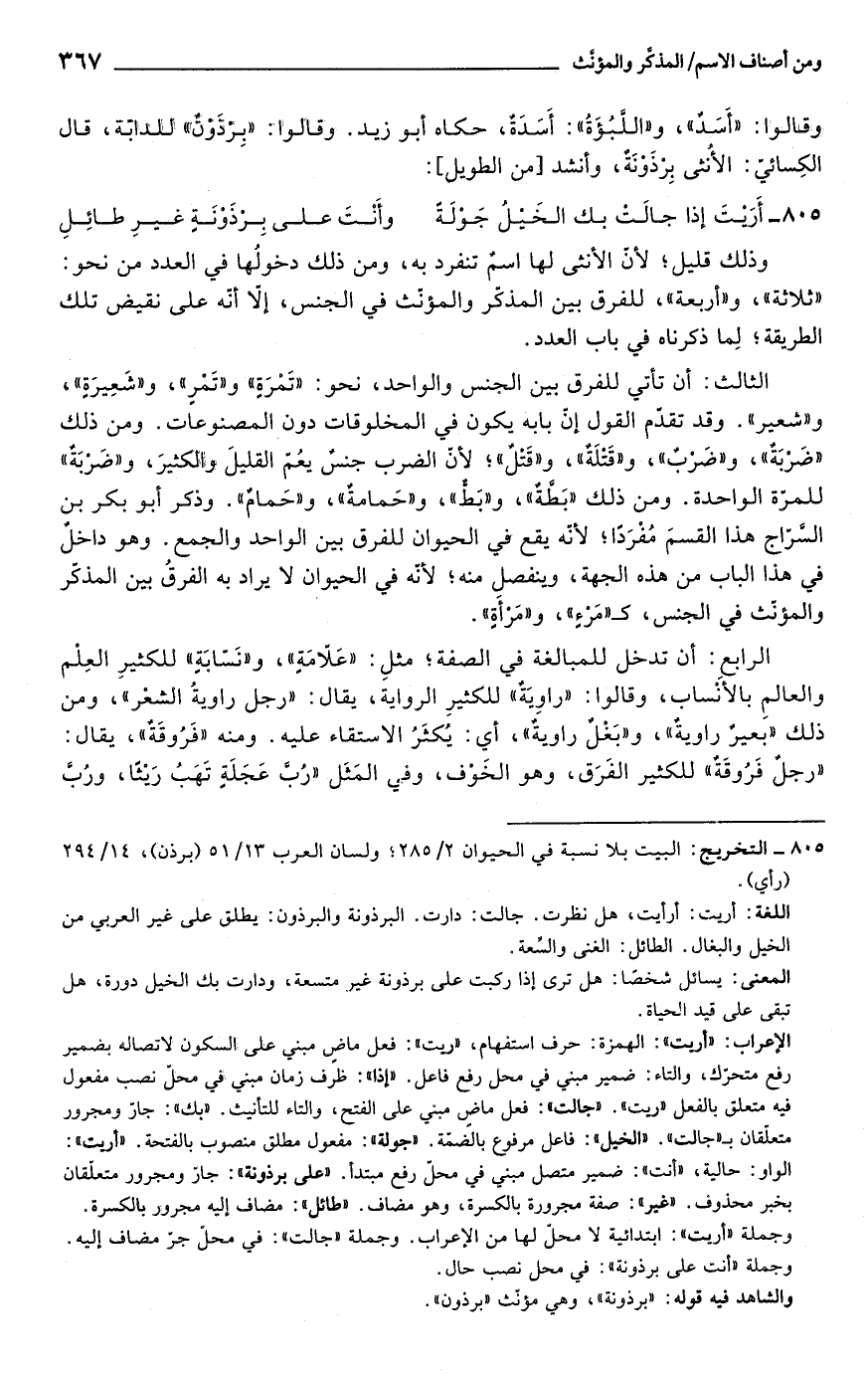 805 - التخريج: البيت بلا نسبة في الحيوان 2/ 285؛ ولسان العرب 13/ 51 (برذن)، 14/ 294 (رأي).