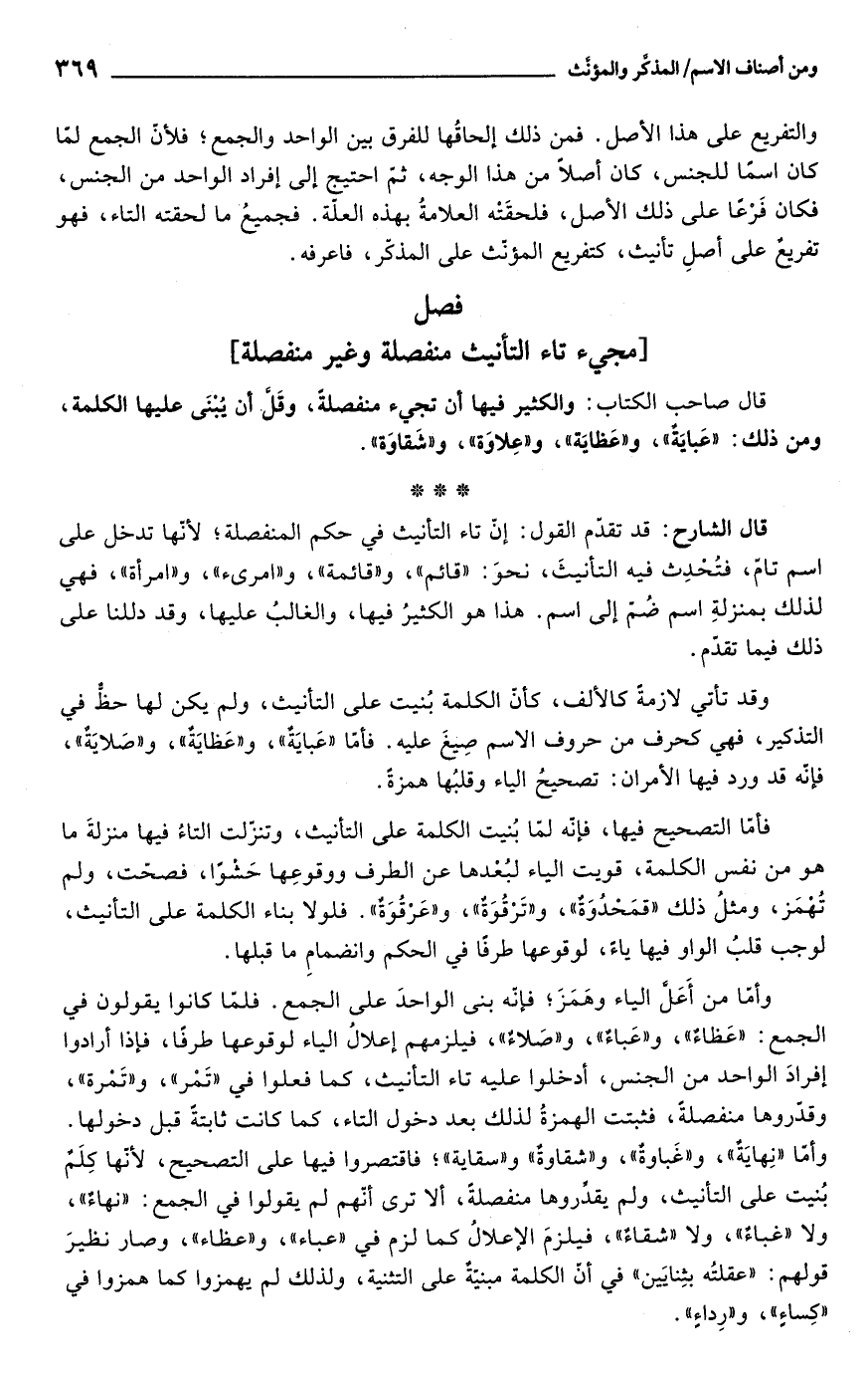 قال الشارح: قد تقدّم القول: إنّ تاء التأنيث في حكم المنفصلة؛ لأنّها تدخل على اسم تامٌ، فتُحْدِث فيه التأنيثَ، نحوَ: "قائم"، و"قائمة"، و"امرىء"، و"امرأة"، فهي لذلك بمنزلةِ اسم ضُمّ إلى اسم. هذا هو الكثيرُ فيها، والغالبُ عليها، وقد دللنا على ذلك فيما تقدّم.