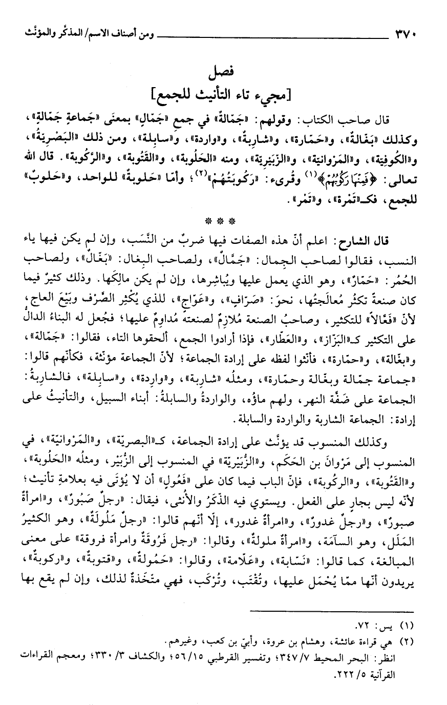 وكذلك المنسوب قد يؤنَّث على إرادة الجماعة، كـ "البصريّة"، و"المَرْوانيّة"، في المنسوب إلى مَرْوانَ بن الحَكَم، و"الزُّبَيْريّة" في المنسوب إلى الزُّبَيْر، ومثلُه "الحَلُوبة"، و"القَتُوبة"، و"الركُوبة"، فإنّ الباب فيما كان على "فَعُولٍ" أن لا يُؤتَى فيه بعلامةِ تأنيث؛ لأنّه ليس بجارٍ على الفعل. ويستوي فيه الذّكَرُ والأُنثى، فيقال: "رجل صَبُورٌ"، و"امرأةٌ صبورٌ"، و"رجلٌ غدورٌ"، و"امرأةٌ غدور"، إلّا أنّهم قالوا: "رجل مَلُولَةٌ"، وهو الكثيرُ المَلَل، وهو السآمَة، و"امرأةٌ ملولةٌ"، وقالوا: "رجل فَرُوقَةٌ وامرأة فروقة" على معنى المبالغة، كما قالوا: "نَسّابة"، و"عَلّامة"، وقالوا: "حَمُولةٌ"، و"قتوبةٌ"، و"ركوبةٌ"، يريدون أنّها ممّا يُحْمَل عليها، وتُقْتَب، وتُرْكَب، فهي متّخَذةٌ لذلك، وإن لم يقع بها