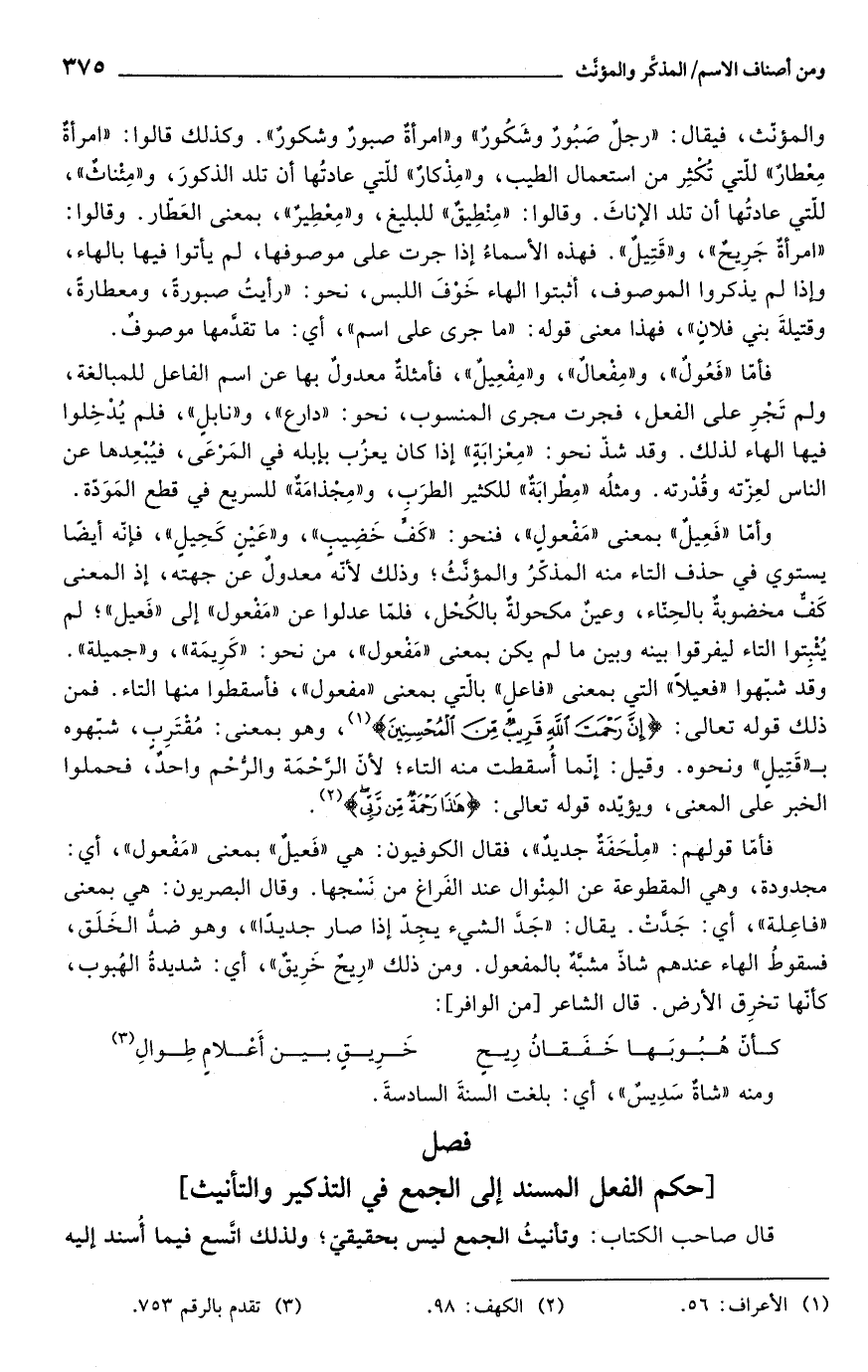 وأمّا "فَعِيلٌ" بمعنى "مَفْعولٍ"، فنحو: "كَفٍّ خَضِيبٍ"، و"عَيْنٍ كَحِيلٍ"، فإنّه أيضًا يستوي في حذف التاء منه المذكّرُ والمؤنَّثُ؛ وذلك لأنّه معدولٌ عن جهته، إذ المعنى كَفٌّ مخضوبةٌ بالحِنّاء، وعينٌ مكحولةٌ بالكُحْل، فلمّا عدلوا عن "مَفْعول" إلى "فَعيل"؛ لم يُثْبِتوا التاء ليفرقوا بينه وبين ما لم يكن بمعنى "مَفْعول"، من نحو: "كَرِيمَة"، و"جميلة". وقد شبّهوا "فعيلاً" التي بمعنى "فاعل" بالّتي بمعنى "مفعول"، فأسقطوا منها التاء. فمن ذلك قوله تعالى: {إِنَّ رَحْمَتَ اللَّهِ قَرِيبٌ مِنَ الْمُحْسِنِينَ} (¬1)، وهو بمعنى: مُقْتَرِبٍ، شبّهوه بـ "قَتِيلٍ" ونحوه. وقيل: إنّما أُسقطت منه التاء؛ لأنّ الرَّحْمَة والرُّحْم واحدٌ، فحملوا الخبر على المعنى، ويؤيّده قوله تعالى: {هَذَا رَحْمَةٌ مِنْ رَبِّي} (¬2).