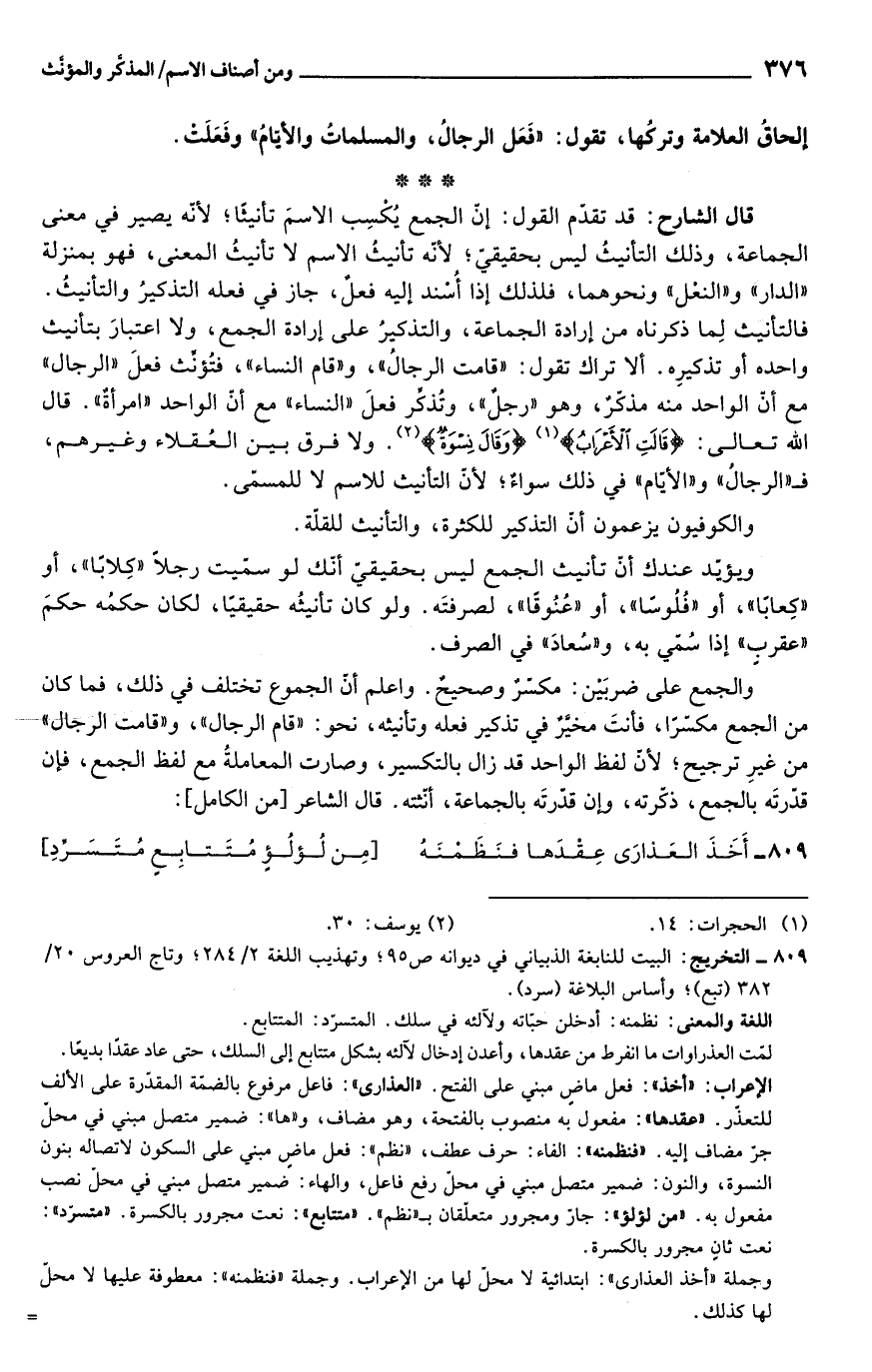 والجمع على ضربَيْن: مكسّرٌ وصحيحٌ. واعلم أنّ الجموع تختلف في ذلك، فما كان من الجمع مكسّرًا، فأنتَ مخيَّرٌ في تذكير فعله وتأنيثه، نحو: "قام الرجال"، و"قامت الرجال" من غيرِ ترجيح؛ لأنّ لفظ الواحد قد زال بالتكسير، وصارت المعاملةُ مع لفظ الجمع، فإن قدّرتَه بالجمع، ذكّرته، وإن قدّرتَه بالجماعة، أنّثته. قال الشاعر [من الكامل]: