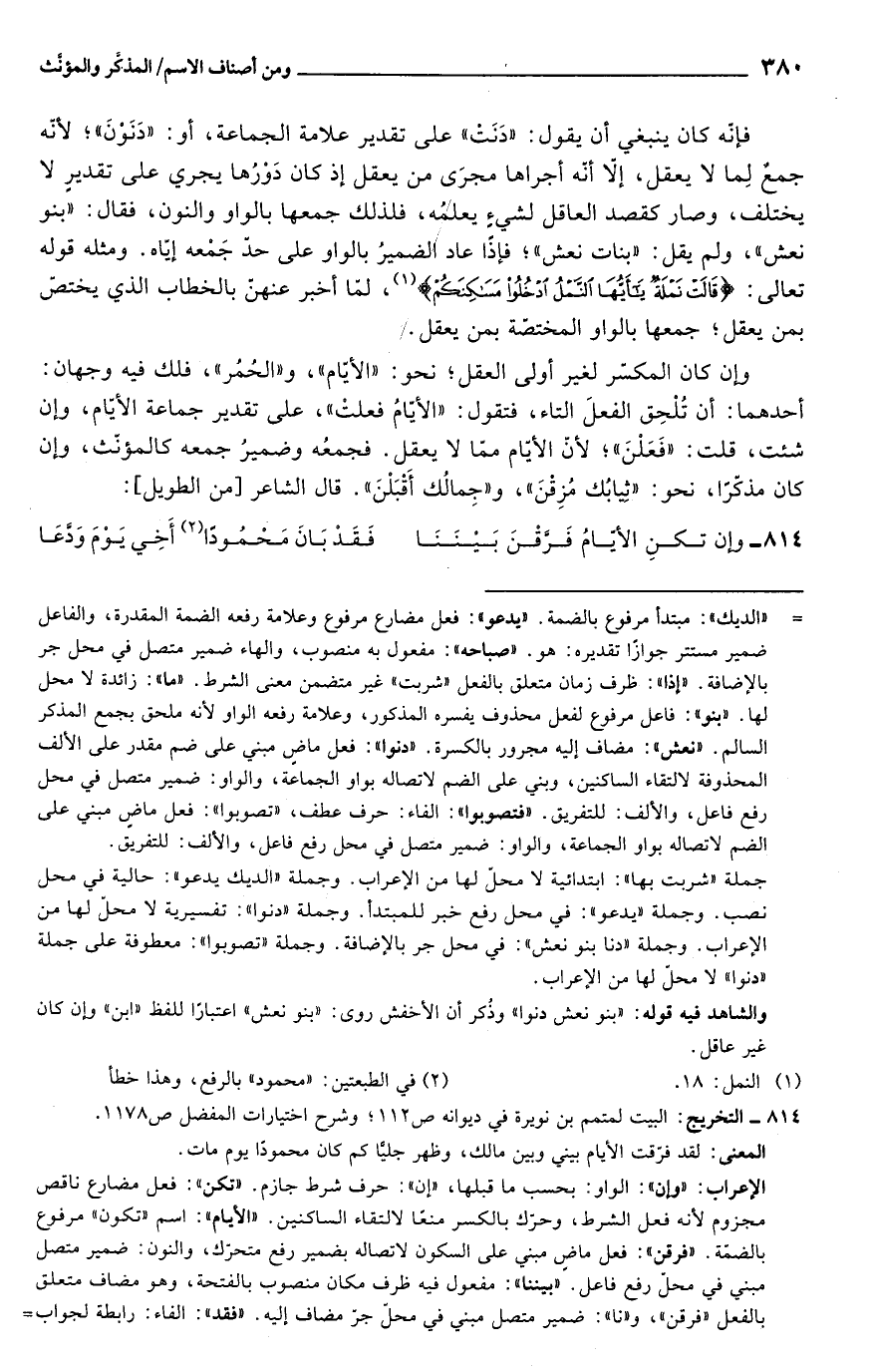 والشاهد فيه قوله: "بنو نعش دنوا" وذُكر أن الأخفش روى: "بنو نعش" اعتبارًا للفظ "ابن" وإن كان غير عاقل.