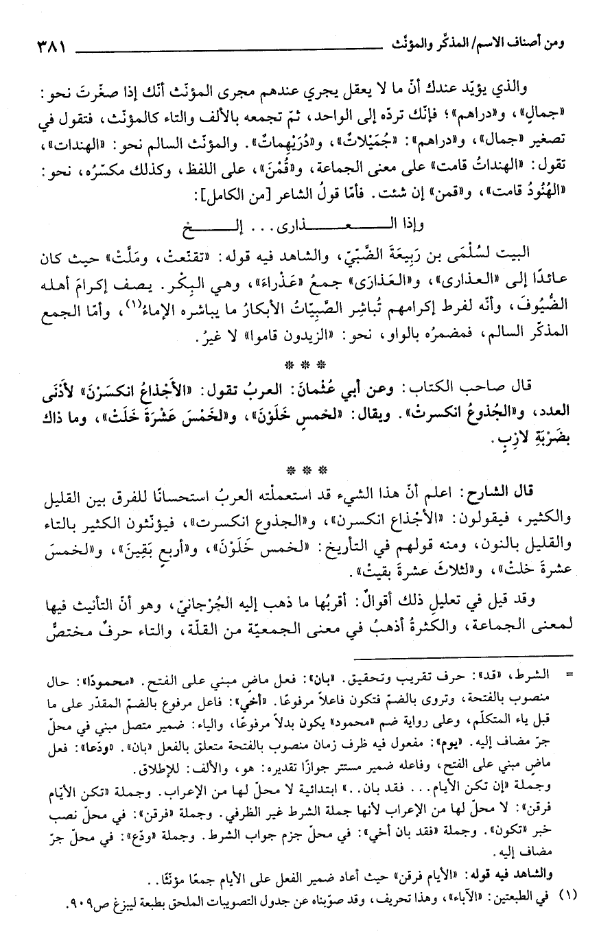 قال الشارح: اعلم أنّ هذا الشيء قد استعملْته العربُ استحسانًا للفرق بين القليل والكثير، فيقولون: "الأجْذاع انكسرن"، و"الجذوع انكسرت"، فيؤنّثون الكثير بالتاء والقليل بالنون، ومنه قولهم في التأريخ: "لخمس خَلَوْنَ"، و"أربعٍ بَقِينَ"، و"لخمسَ عشرةَ خلتْ"، و"لثلاثَ عشرةَ بقيتْ".