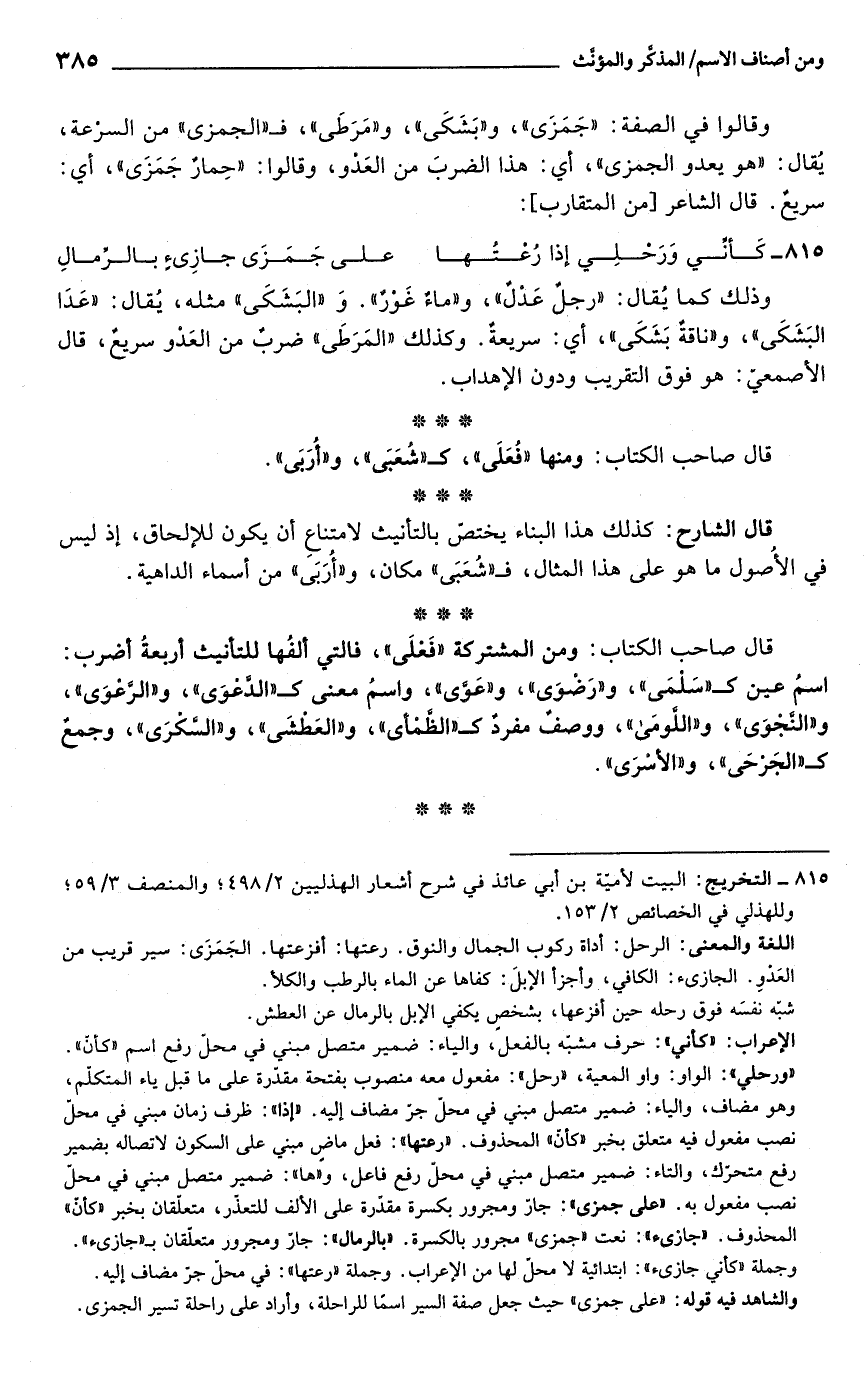 قال الشارح: كذلك هذا البناء يختصّ بالتأنيث لامتناعِ أن يكون للإلحاق، إذ ليس فى الأُصول ما هو على هذا المثال، فـ "شُعَبَى" مكان، و"أُرَبَى" من أسماء الداهية.