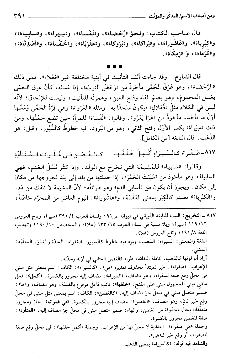 قال الشارح: وقد جاءت ألف التأنيث في أبنية مختلفة غيرِ "فَعْلاء"، فمن ذلك "الرُّحَضاءُ"، وهو عَرَقُ الحُمَّى مأخوذٌ من "رَحَضَ الثوبَ"، إذا غسله، كأنّ عرق الحمّى يغسل المحمومَ، وهو بضمّ الفاء وفتح العين، وهمزتُه للتأنيث، وليست للإلحاق؛ لأنّه ليس في الكلام مثلُ "فُعَلالٍ" فيكونَ ملحقًا به. ومثله "العُرَواءُ" وهي قِرَّةُ الحُمَّى وَمَسُّها أوّلَ ما تأخذ، مأخوذٌ من "عَرَا يَعْرُو". وقالوا: "نُفَساءُ" للمرأة حين تضع حَمْلَها، ومن ذلك "سِيَراءُ" بكسر الأوّل وفتح الثاني، وهو من البُرود، فيه خطوطٌ كالسُّيُور، وقيل: هو الذَّهَب. قال النابغة [من الكامل]: