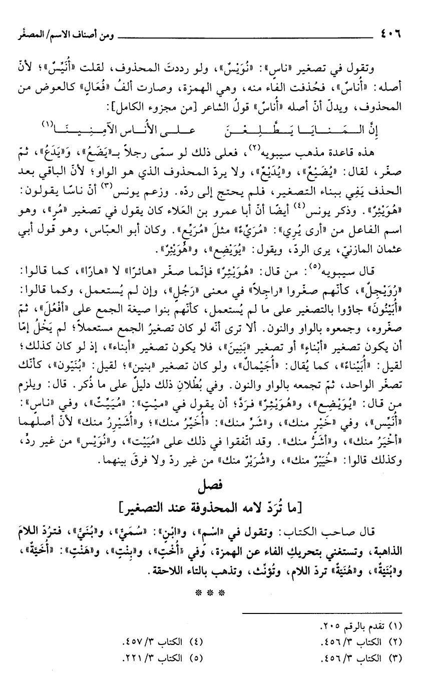 وتقول في تصغير "ناسٍ": "نُوَيْسٌ"، ولو رددتَ المحذوف، لقلت "أُنَيسٌ"؛ لأنّ أصله: "أُناسٌ"، فحُذفت الفاء منه، وهي الهمزة، وصارت ألفُ "فُعَالٍ" كالعوض من المحذوف، ويدلّ أنّ أصله "أُناسٌ" قولُ الشاعر [من مجزوء الكامل]: