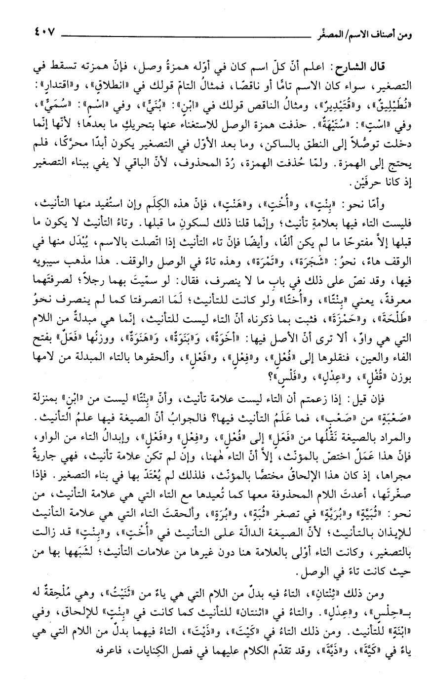 قال الشارح: اعلم أنّ كلّ اسم كان في أوّله همزةُ وصل، فإنّ همزته تسقط في التصغير، سواء كان الاسم تامًّا أو ناقصًا، فمثالُ التامّ قولك في "انطلاقٍ"، و"اقتدارٍ": "نُطَيْلِيقٌ"، و"قُتَيْدِيرٌ"، ومثالُ الناقص قولك في "ابْنٍ": "بُنَيٌّ"، وفي "اسْمٍ": "سُمَيٌّ"، وفي "اسْتٍ": "سُتَيْهَةٌ". حذفت همزة الوصل للاستغناء عنها بتحريكِ ما بعدها؛ لأنّها إنّما دخلت توصُّلًا إلى النطق بالساكن، وما بعد الأوّل في التصغير يكون أبدًا محرَّكًا، فلم يحتج إلى الهمزة. ولمّا حُذفت الهمزة، رُدّ المحذوف، لأنّ الباقي لا يفي ببناء التصغير إذ كانا حرفَيْن.