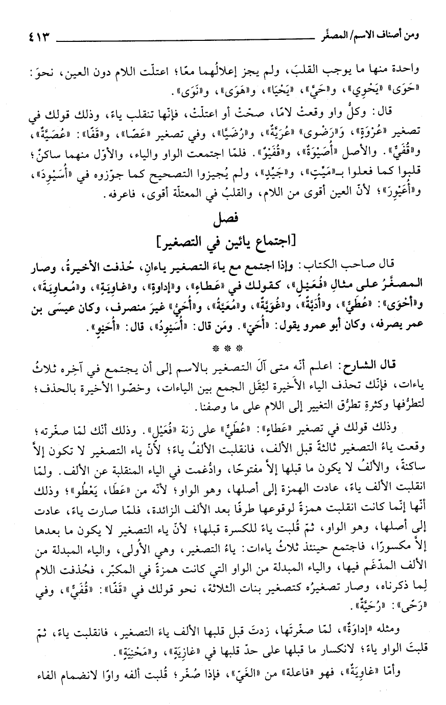 قال الشارح: اعلم أنّه متى آلَ التصغير بالاسم إلى أن يجتمع في آخِره ثلاثُ ياءات، فإنّك تحذف الياء الأخَيرة لثِقَل الجمع بين الياءات، وخصّوا الأخيرة بالحذف؛ لتطرُّفها وكثرةِ تطرُّق التغيير إلى اللام على ما وصفنا.
