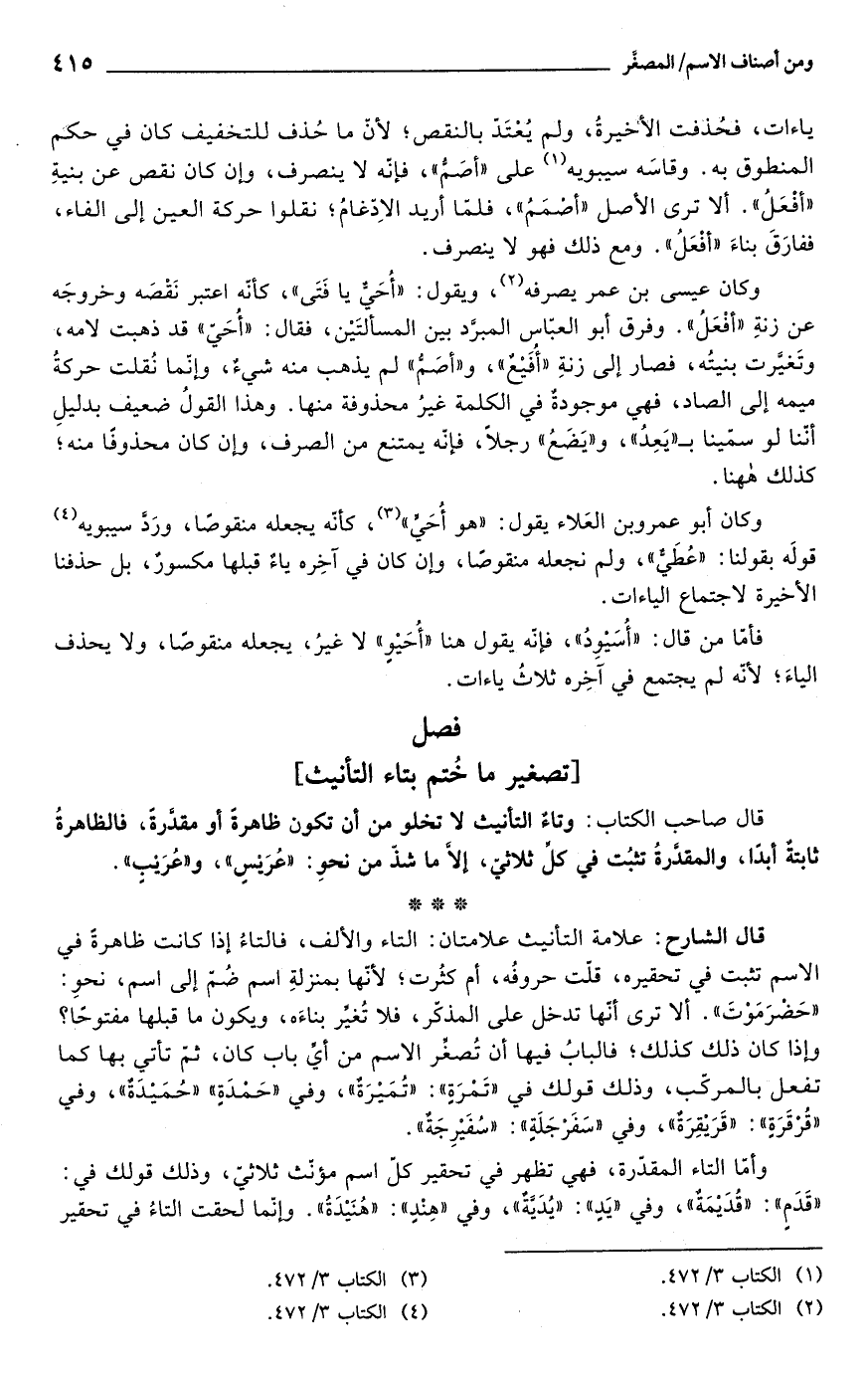 وكان أبو عمرو بن العَلاء يقول: "هو أُحَيٍّ" (¬3)، كأنَّه يجعله منقوصًا، ورَدَّ سيبويه (¬4) قولَه بقولنا: "عُطَيٌّ"، ولم نجعله منقوصًا، وإن كان في آخِره ياءٌ قبلها مكسورٌ، بل حذفنا الأخيرة لاجتماع الياءات.