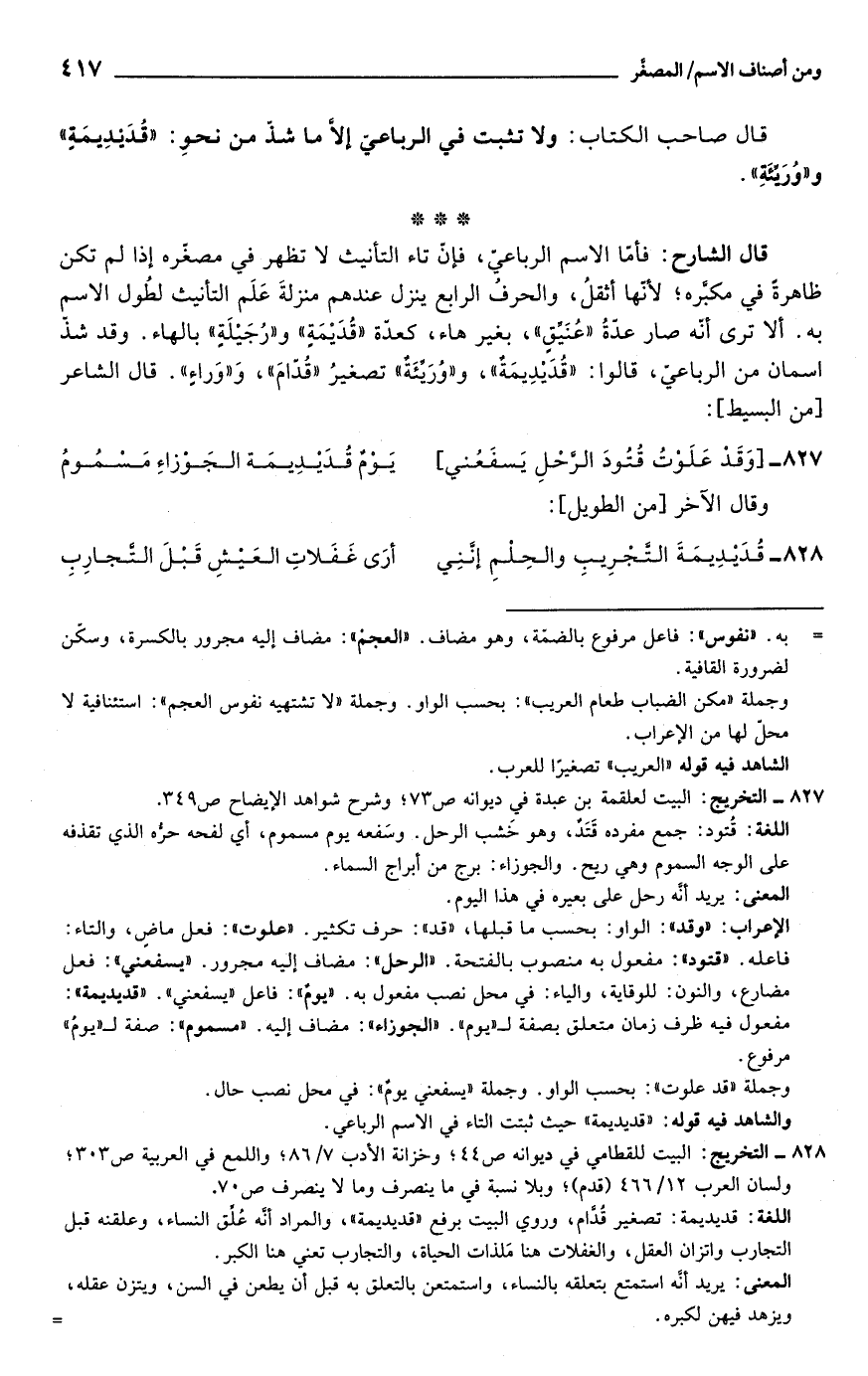 قال الشارح: فأمّا الاسم الرباعيّ، فإنّ تاء التأنيث لا تظهر في مصغّره إذا لم تكن ظاهرةً في مكبَّره؛ لأنها أثقلُ، والحرفُ الرابع ينزل عندهم منزلةَ عَلَم التأنيث لطُول الاسم به. ألا ترى أنه صار عدةُ "عُنَيِّقٍ"، بغير هاء، كعدّة "قُدَيْمَةٍ" و"رُجَيْلَةٍ" بالهاء. وقد شذّ اسمان من الرباعيّ، قالوا: "قُدَيْدِيمَةٌ"، و"وُرَيئَةٌ" تصغيرُ "قُدّامَ"، وَ"وَراءٍ". قال الشاعر [من البسيط]: