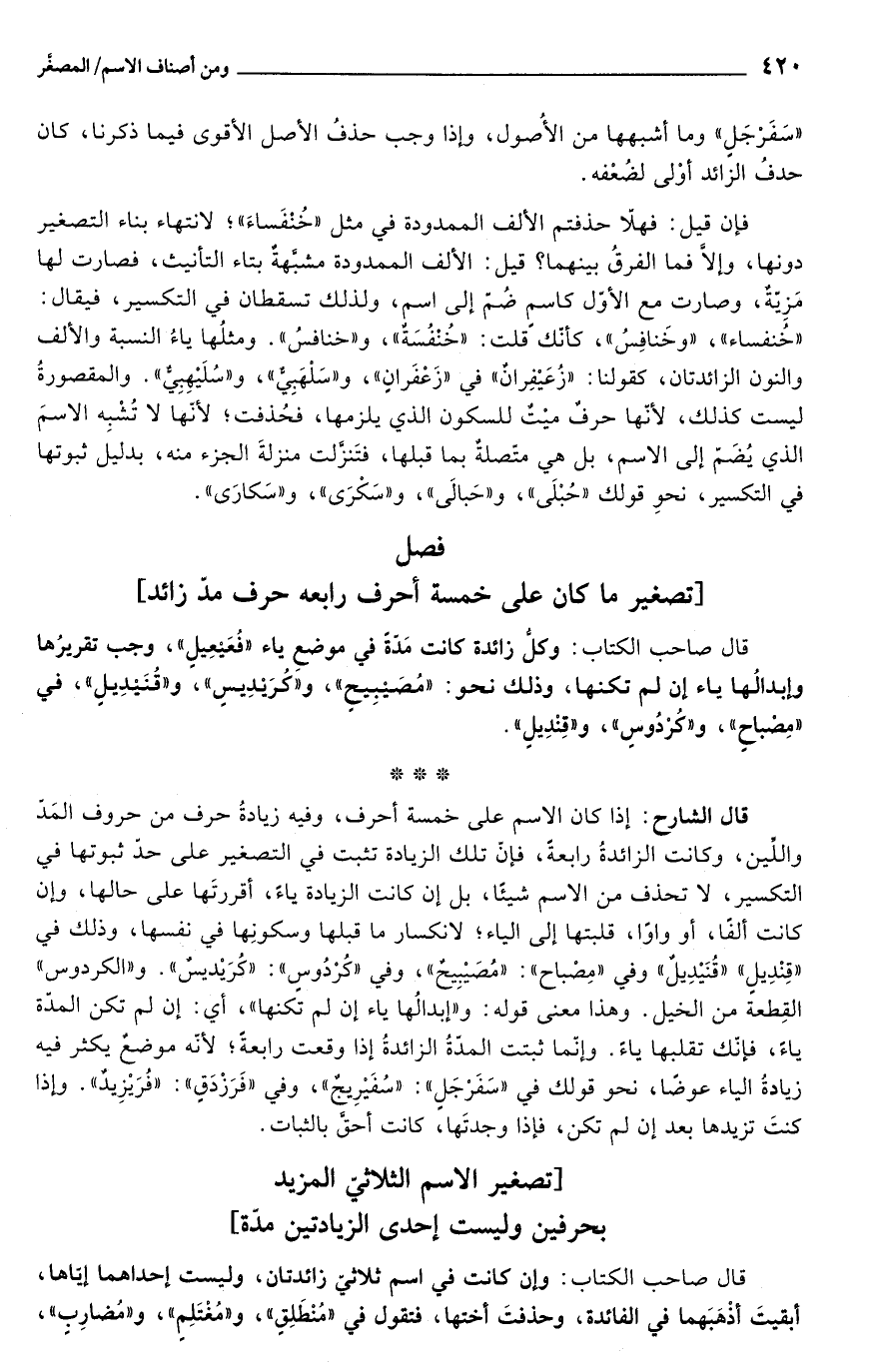 قال الشارح: إذا كان الاسم على خمسة أحرف، وفيه زيادةُ حرف من حروف المَدّ واللّين، وكانت الزائدةُ رابعةً، فإنّ تلك الزيادة تثبت في التصغير على حدّ ثبوتها في التكسير، لا تحذف من الاسم شيئًا، بل إن كانت الزيادة ياءً، أقررتَها على حالها، وإن كانت ألفًا، أو واوًا، قلبتها إلى الياء؛ لانكسار ما قبلها وسكونِها في نفسها، وذلك في "قِنْدِيلٍ" "قُنَيْدِيلٌ" وفي "مِصْباح": "مُصَيْبِيحٌ"، وفي "كُرْدُوسٍ": "كُرَيْديسٌ". و"الكردوس" القِطعة من الخيل. وهذا معنى قوله: و"إبدالُها ياء إن لم تكنها"، أي: إن لم تكن المدّة ياءً، فإنّك تقلبها ياءً. وإنّما ثبتت المدّةُ الزائدةُ إذا وقعت رابعةً؛ لأنّه موضعٌ يكثر فيه زيادةُ الياء عوضًا، نحو قولك في "سَفَرْجَلٍ": "سُفَيْرِيجٌ"، وفي "فَرَزْدَقٍ": "فُرَيْزِيدٌ". وإذا كنتَ تزيدها بعد إن لم تكن، فإذا وجدتَها، كانت أحق بالثبات.