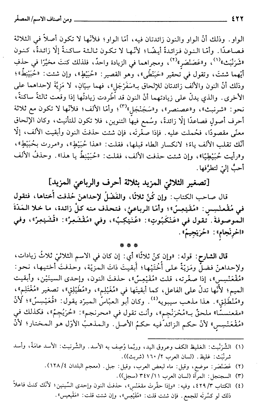 قال صاحب الكتاب: وإن كن ثلاثاً, والفضل لإحداهن حذفت أختاها, فتقول في مقعنسس: "مُقيعسٌ"؛ وأما الرباعي, فتحذف منه كل زائدة, ما خلا المدة الموصوفة. تقول في "عنكبوتٍ": "عُنيكبٌ" وفي "مقشعرٌّ": "قُشيعرٌ", وفي "احرنجامٍ": "حُريجيمٌ".
