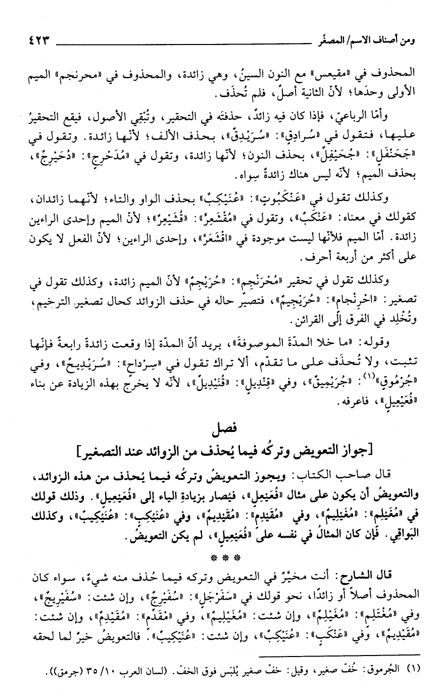 قال الشارح: أنت مخيَّرٌ في التعويض وتركه فيما حُذف منه شيءٌ، سواء كان المحذوف أصلًا أو زائدًا، نحو قولك في "سَفَرجَلٍ": "سُفَيْرِجٌ"، وإن شئت: "سُفَيْرِيجٌ"، وفي "مُغْتَلِمٍ": "مُغَيْلِمٌ"، وإن شئت: "مُغَيْلِيمٌ"، وفي "مْقَدمٍ": "مُقَيْدِمٌ"، وإن شئت: "مُقَيْدِيمٌ"، وفي "عَنْكَبٍ": "عُنَيْكِبٌ"، وإن شئت: "عُنَيْكِيبٌ". فالتعويضُ خيرٌ لما لحقه