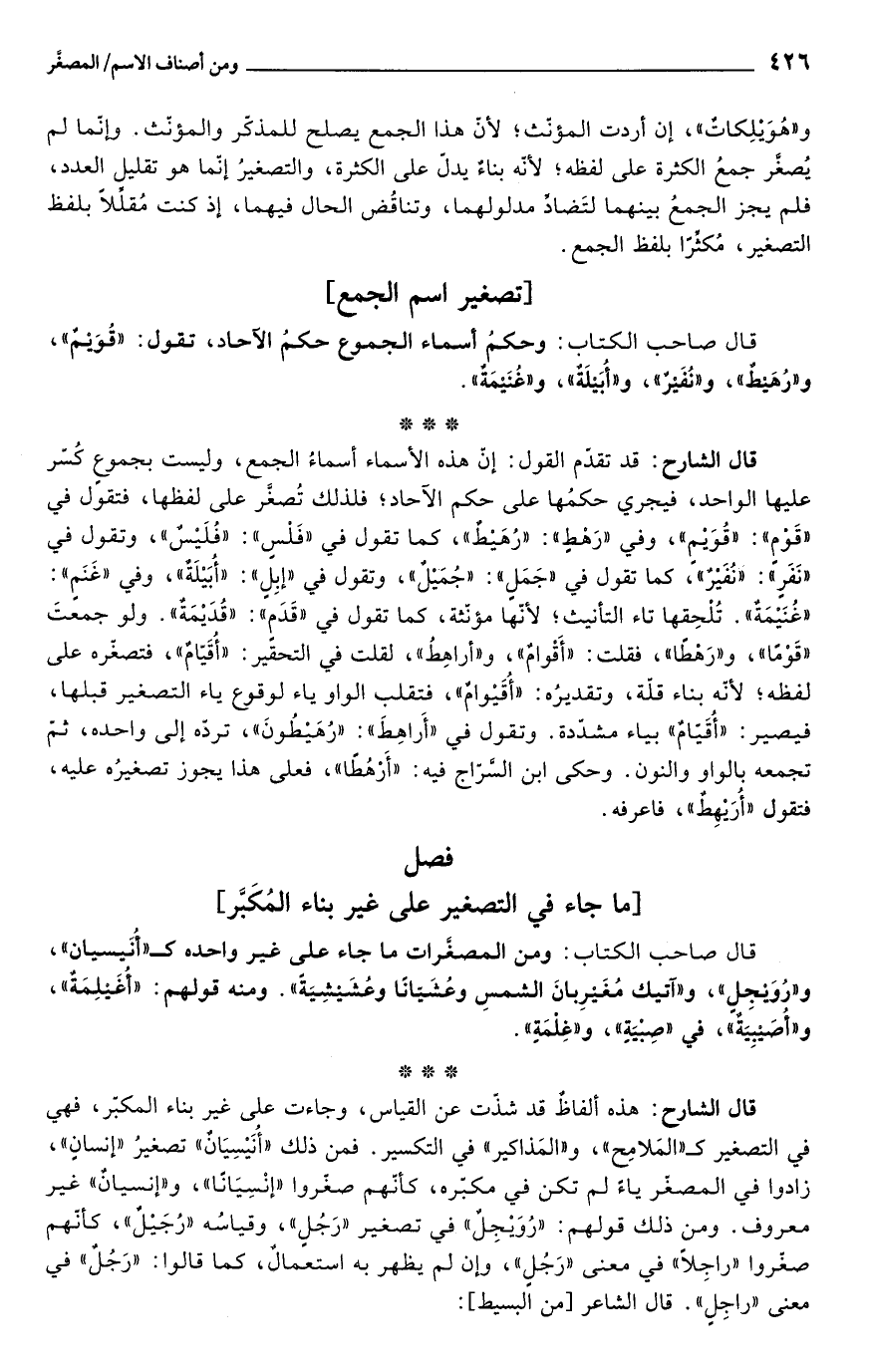 قال الشارح: قد تقدّم القول: إنّ هذه الأسماء أسماءُ الجمع، وليست بجموع كُسّر عليها الواحد، فيجري حكمُها على حكم الآحاد؛ فلذلك تُصغَّر على لفظها، فتقول في "قَوم": "قُوَيْمٍ"، وفي "رَهْطٍ": "رُهَيْطٌ"، كما تقول في "فَلْسٍ": "فُلَيْسٌ"، وتقول في "نَفَرٍ": "نُفَيْرٌ"، كما تقول في "جَمَلٍ": "جُمَيْلٌ"، وتقول في "إبِلٍ": "أُبَيْلَةٌ"، وفي "غَنَمٍ": "غُنَيْمَةٌ". تُلْحِقها تاء التأنيث؛ لأنّها مؤنّثة، كما تقول في "قَدَمٍ": "قُدَيْمَةٌ". ولو جمعتَ "قَوْمًا"، و"رَهْطًا"، فقلت: "أَقْوامٌ"، و"أراهِطُ"، لقلت في التحقير: "أُقَيّامٌ"، فتصغّره على لفظه؛ لأنّه بناء قلّة، وتقديرُه: "أُقَيْوامٌ"، فتقلب الواو ياء لوقوع ياء التصغير قبلها، فيصير: "أُقَيّامٌ" بياء مشدّدة. وتقول في "أَراهِطَ": "رُهَيْطُونَ"، تردّه إلى واحده، ثمّ تجمعه بالواو والنون. وحكى ابن السّرّاج فيه: "أَرْهُطًا"، فعلى هذا يجوز تصغيرُه عليه، فتقول "أُرَيْهِطٌ"، فاعرفه.