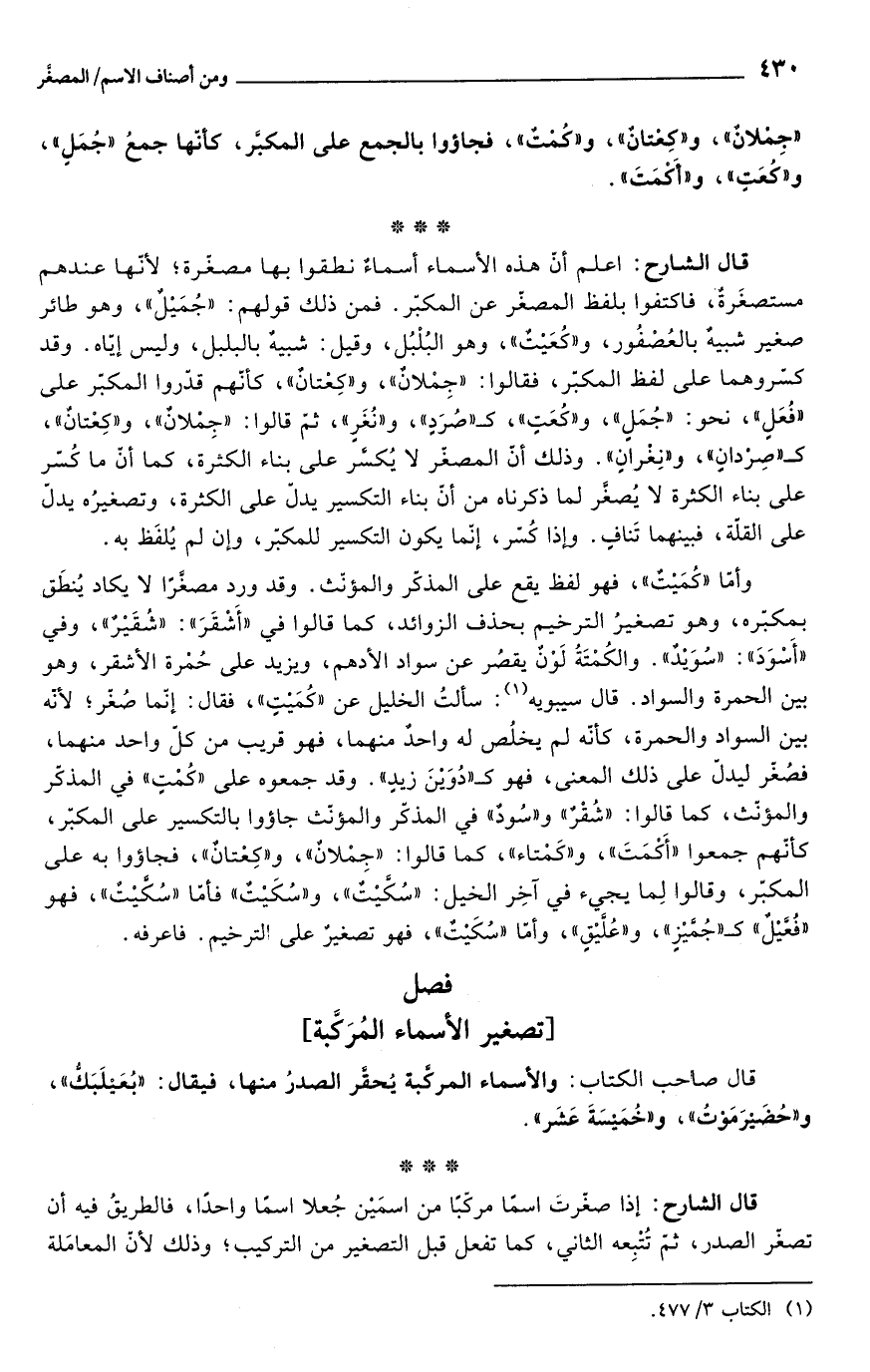 قال الشارح: إذا صغّرتَ اسمًا مركبًا من اسمَيْن جُعلا اسمًا واحدًا، فالطريقُ فيه أن تصغّر الصدر، ثمّ تُتْبِعه الثاني، كما تفعل قبل التصغير من التركيب؛ وذلك لأنّ المعامَلة