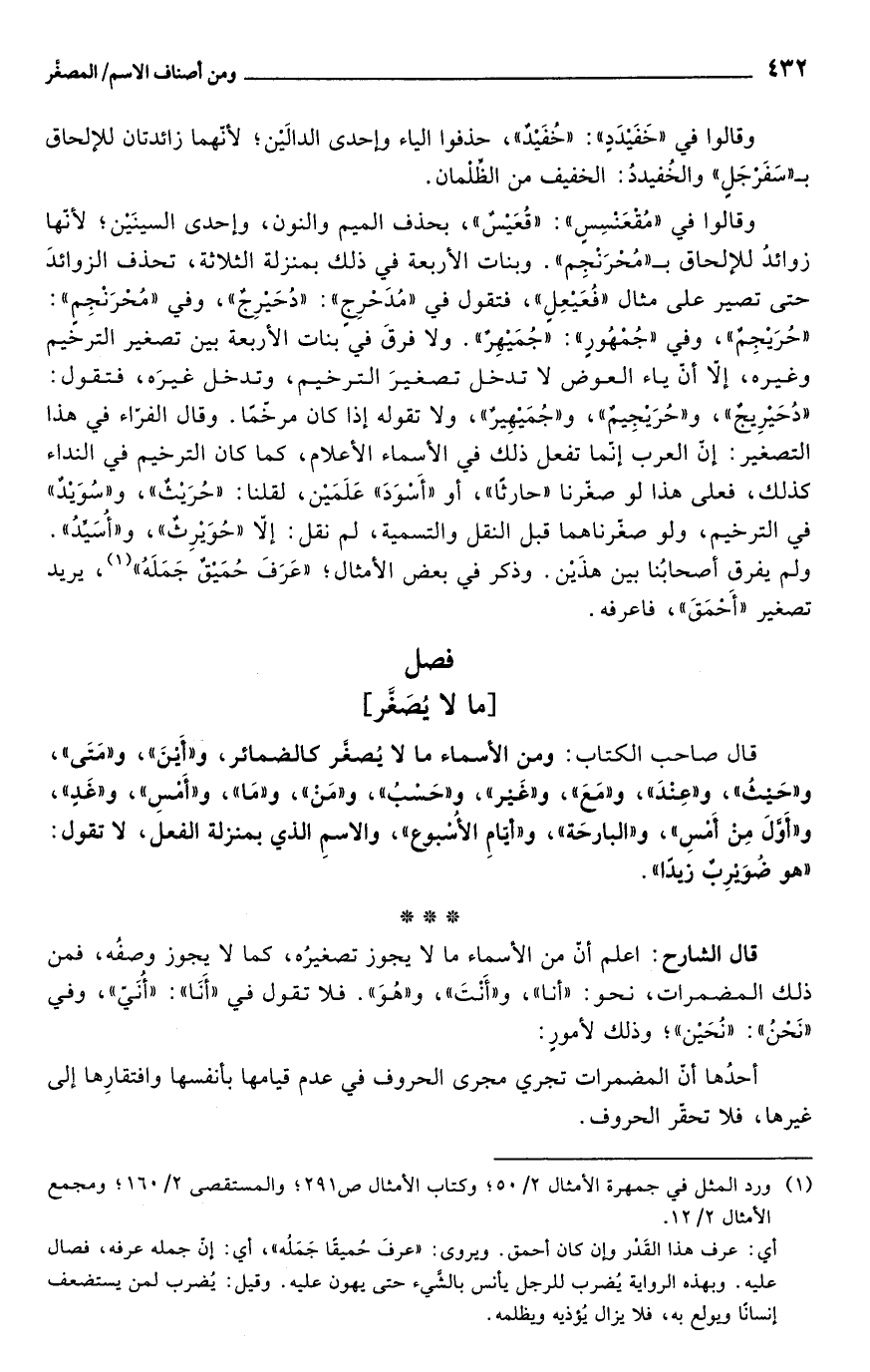 قال صاحب الكتاب: ومن الأسماء ما لا يصغر كالضمائر, و"أين", و"متى", و"حيث", و"عند", و"مع", و"غير", و"حسب", و"من", و"ما", و"أمس", و"غدٍ", و"أول من أمس", و"البارحة", و"أيام الأسبوع", والاسم الذي بمنزلة الفعل, لا تقول: "هو ضويربٌ زيدًا".