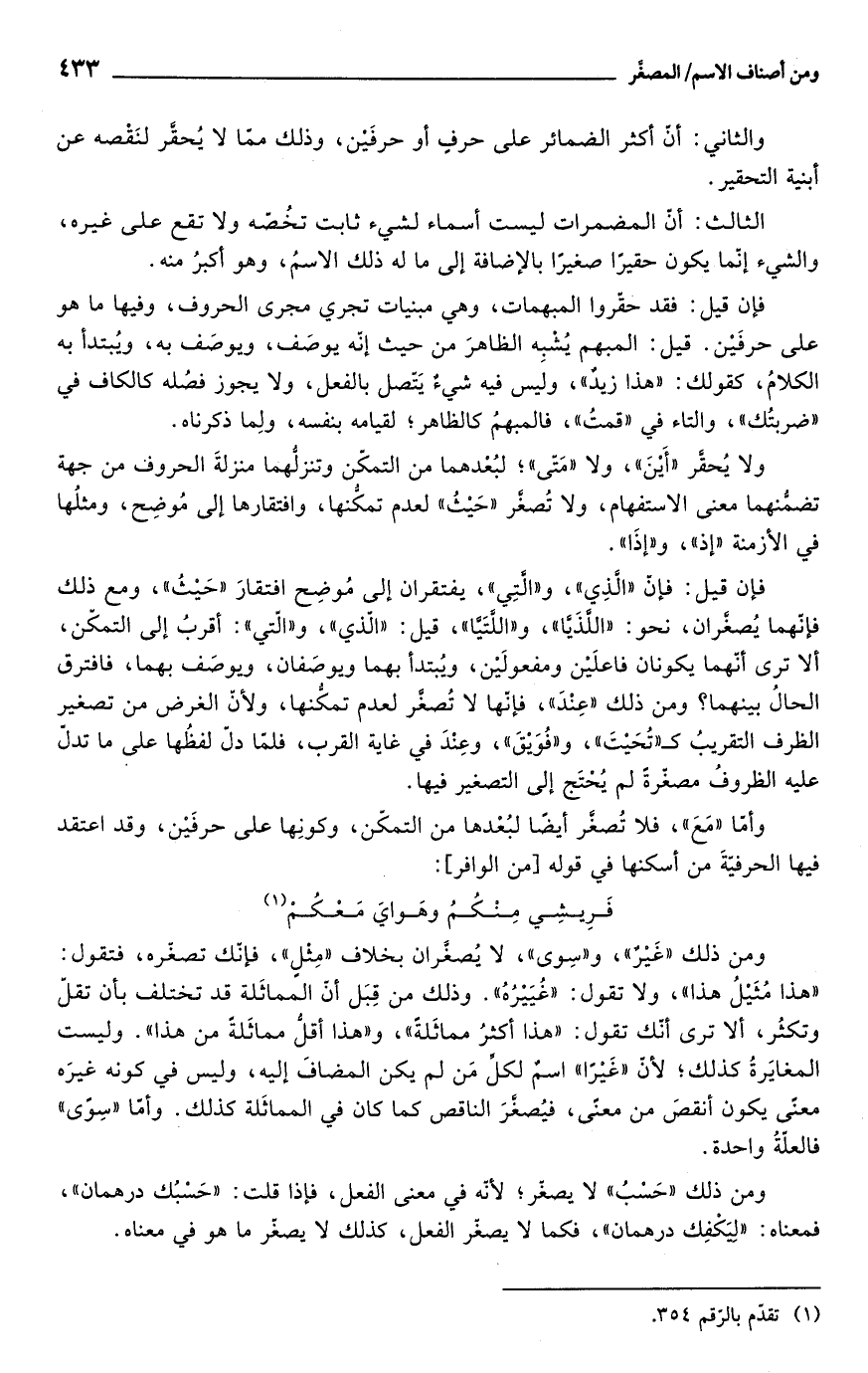 فإن قيل: فقد حقّروا المبهمات، وهي مبنيات تجري مجرى الحروف، وفيها ما هو على حرفَيْن. قيل: المبهم يُشبِه الظاهرَ من حيث إنّه يوصَف، ويوصَف به، ويُبتدأ به الكلامُ، كقولك: "هذا زيدٌ"، وليس فيه شيءٌ يَتّصل بالفعل، ولا يجوز فصُله كالكاف في "ضربتُك"، والتاء في "قمتُ"، فالمبهمُ كالظاهر؛ لقيامه بنفسه، ولِما ذكرناه.