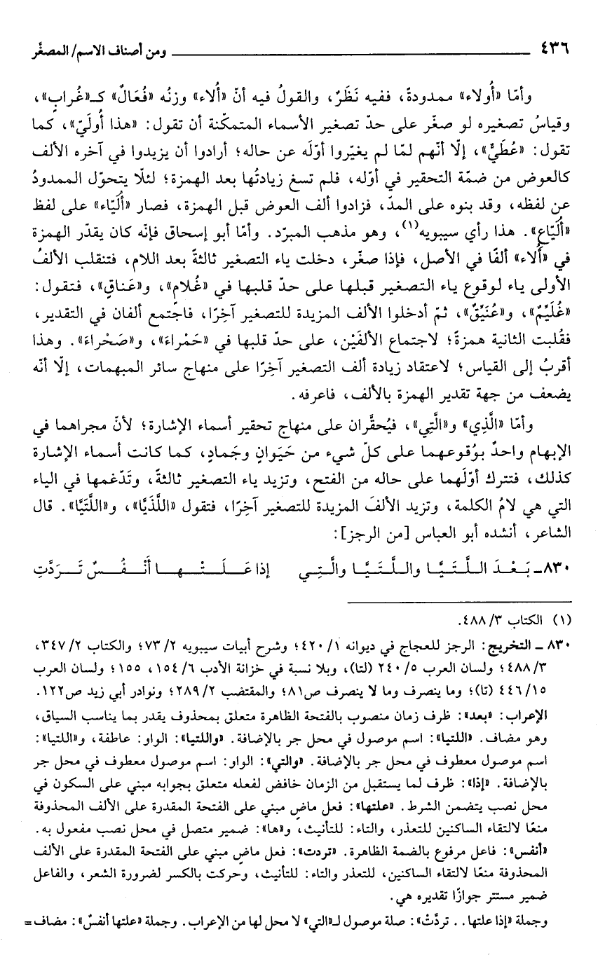 وأمّا "أُولاء" ممدودةً، ففيه نظرٌ، والقولُ فيه أن "أُلاء" وزنُه "فُعَالٌ" كـ"غُرابٍ"، وقياسُ تصغيره لو صغّر على حدّ تصغير الأسماء المتمكّنة أن تقول: "هذا أُولي"، كما تقول: "عُطَيٌّ"، إلا أنّهم لمّا لم يغيّروا أوّلَه عن حاله؛ أرادوا أن يزيدوا في آخره الألف كالعوض من ضمّة التحقير في أوّله، فلم تسغ زيادتُها بعد الهمزة؛ لئلاّ يتحوّل الممدودُ عن لفظه، وقد بنوه على المدّ، فزادوا ألف العوض قبل الهمزة، فصار "أُليّاء" على لفظ "أُليّاع". هذا رأى سيبويه (¬1)، وهو مذهب المبرّد. وأمّا أبو إسحاق فإنّه كان يقدّر الهمزة في "ألاء" ألفًا في الأصل، فإذا صغّر، دخلت ياء التصغير ثالثةً بعد اللام، فتنقلب الألفُ الأولى ياء لوقوع ياء التصغير قبلها على حدّ قلبها في "غُلامٍ"، و"عَناقٍ"، فتقول: "غُلَيِّمٌ"، و"عُنَيِّقٌ"، ثمّ أدخلوا الألف المزيدة للتصغير آخِرًا، فاجتمع ألفان في التقدير، فقُلبت الثانية همزة؛ لاجتماع الألفَيْن، على حدّ قلبها في "حَمْراءَ"، و"صَحْراءَ". وهذا أقربُ إلى القياس؛ لاعتقاد زيادة ألف التصغير آخِرًا على منهاج سائر المبهمات، إلا أنّه يضعف من جهة تقدير الهمزة بالألف، فاعرفه.