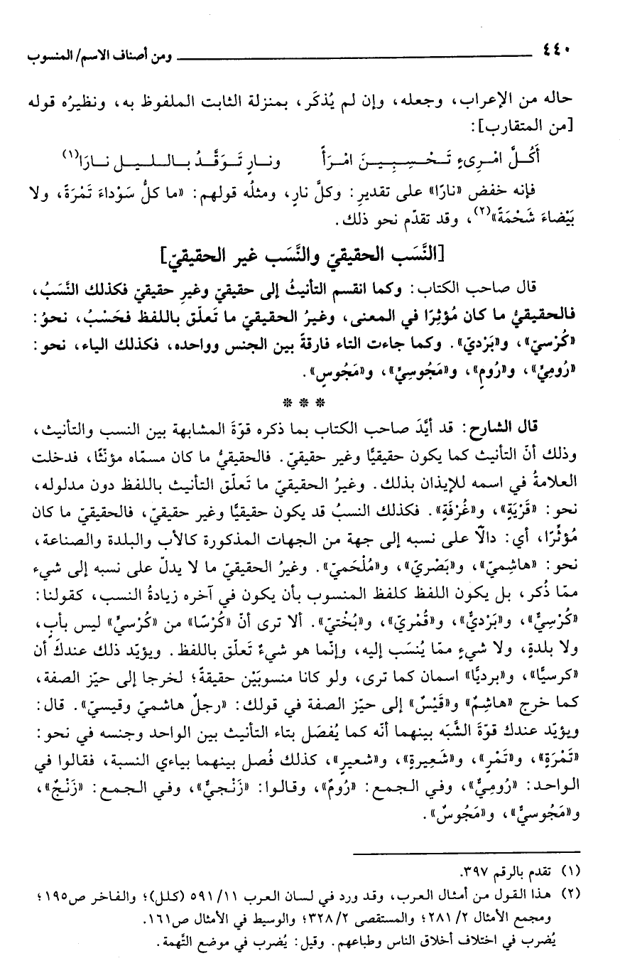 قال الشارح: قد أيَّدَ صاحب الكتاب بما ذكره قوّةَ المشابهة بين النسب والتأنيث، وذلك أنّ التأنيث كما يكون حقيقيًّا وغير حقيقي. فالحقيقيُّ ما كان مسمّاه مؤنّثًا، فدخلت العلامةُ في اسمه للإيذان بذلك. وغيرُ الحقيقيّ ما تَعلّق التأنيث باللفظ دون مدلوله، نحو: "قَريَةٍ"، و"غُرفَةٍ". فكذلك النسبُ قد يكون حقيقيًّا وغير حقيقيّ، فالحقيقيّ ما كان مُوْثرًا، أي: دالا على نسبه إلى جهة من الجهات المذكورة كالأب والبلدة والصناعة، نحو: "هاشِميّ"، و"بَصْريّ"، و"مُلحَميّ". وغيرُ الحقيقيّ ما لا يدلّ على نسبه إلى شيء ممّا ذُكر، بل يكون اللفظ كلفظ المنسوب بأن يكون في آخره زيادةُ النسب، كقولنا: "كُرسِيٌّ"، و"بَرْديٌّ"، و"قُمْريّ"، و"بُختيّ". ألا ترى أنّ "كُرْسًا" من "كُرْسيٍّ" ليس بأبٍ، ولا بلدةٍ، ولا شيء ممّا يُنسَب إليه، وإنّما هو شيءٌ تَعلّق باللفظ. ويؤيد ذلك عندكَ أنّ "كرسيًّا"، و"برديًّا" اسمان كما ترى، ولو كانا منسوبَين حقيقةً؛ لخرجا إلى حيّز الصفة، كما خرج "هاشِمٌ" و"قَيْسٌ" إلى حيّز الصفة في قولك: "رجلٌ هاشميّ وقيسيّ". قال: ويؤيّد عندك قوّةَ الشَّبَه بينهما أنّه كما يُفصَل بتاء التأنيث بين الواحد وجنسه في نحو: "تَمرَةٍ"، و"تَمرٍ"، و"شَعِيرةٍ"، و"شعيرٍ"، كذلك فُصل بينهما بياءي النسبة، فقالوا في الواحد: "رُومِيٌّ"، وفي الجمع: "رُومٌ"، وقالوا: "زَنْجيٌّ"، وفي الجمع: "زَنْجٌ"، و"مَجُوسيٌّ"، و"مَجُوسٌ".