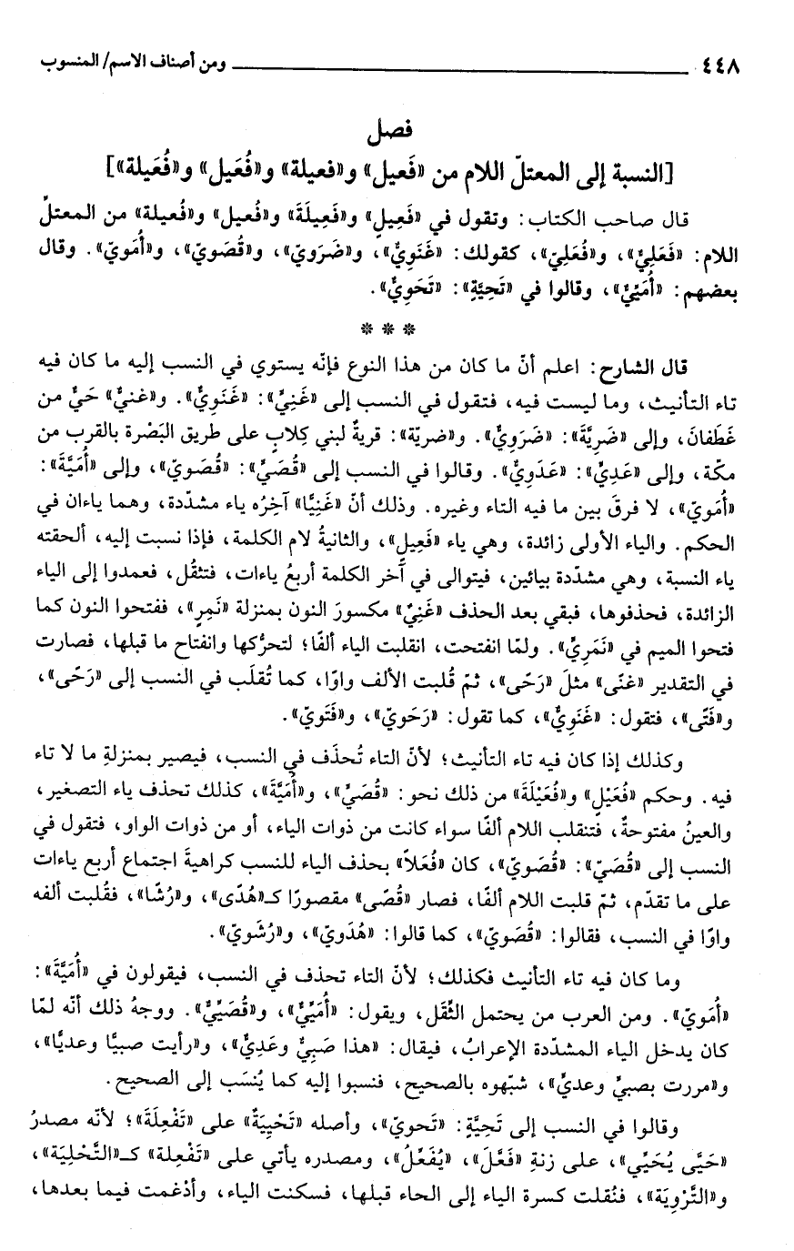 قال الشارح: اعلم أنّ ما كان من هذا النوع فإنّه يستوي في النسب إليه ما كان فيه تاء التأنيث، وما ليست فيه، فتقول في النسب إلى "غَنِيٍّ": "غَنَوِيٌّ". و"غنيٌّ" حَيٌّ من غَطَفانَ، وإلى "ضَرِيَّةَ": "ضَرَوِيٌّ". و"ضريّة": قريةٌ لبني كِلابٍ على طريق البَصرة بالقرب من مكّة، وإلى "عَدِيٍّ": "عَدَوِيٌّ". وقالوا في النسب إلى "قُصَيٍّ": "قُصَويّ"، وإلى "أُمَيَّةَ": "أُمَويّ"، لا فرقَ بين ما فيه التاء وغيره. وذلك أنّ "غَنِيًّا" آخِرُه ياء مشدّدة، وهما ياءان في الحكم. والياء الأولى زائدة، وهي ياء "فَعِيلٍ"، والثانيةُ لام الكلمة، فإذا نسبت إليه، ألحقته ياء النسبة، وهي مشدّدة بيائين، فيتوالى في آخر الكلمة أربعُ ياءات، فتثقُل، فعمدوا إلى الياء الزائدة، فحذفوها، فبقي بعد الحذف "غَنِيٌ" مكسورَ النون بمنزلة "نَمِرٍ"، ففتحوا النون كما فتحوا الميم في "نَمَرِيّ". ولمّا انفتحت، انقلبت الياء ألفًا؛ لتحرُّكها وانفتاح ما قبلها, فصارت في التقدير "غنًى" مثلَ "رَحى"، ثمّ قُلبت الألف واوًا، كما تقلَب في النسب إلى "رَحى"، و"فَتًى"، فتقول: "غَنَوِيٌّ"، كما تقول: "رَحَويّ"، و"فَتَويّ".