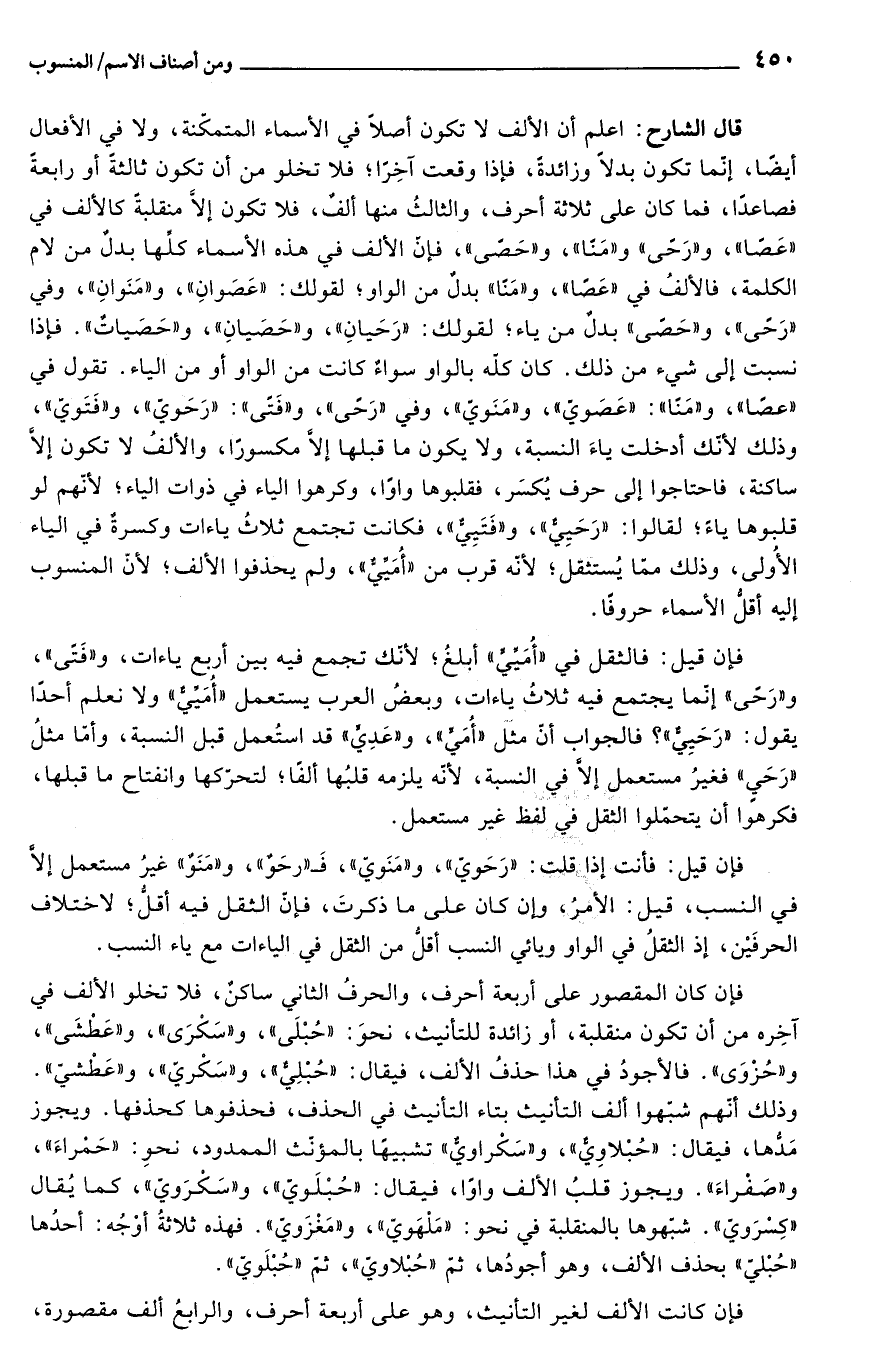 قال الشارح: اعلم أنّ الألف لا تكون أصلًا في الأسماء المتمكنة، ولا في الأفعال أيضًا، إنّما تكون بدلاً وزائدةً، فإذا وقعت آخِرًا؛ فلا تخلو من أنّ تكون ثالثةً أو رابعةً فصاعدًا، فما كان على ثلاثة أحرف، والثالثُ منها ألفٌ، فلا تكون إلا منقلبةٌ كالألف في "عَصًا"، و"رَحًى" و"مَنًا"، و"حَصًى"، فإنّ الألف في هذه الأسماء كلّها بدلٌ من لام الكلمة، فالألفُ في "عَصًا"، و"مَنًا" بدلٌ من الواو؛ لقولك: "عَصَوانِ"، و"مَنَوانِ"، وفي "رَحًى"، و"حَصًى" بدلٌ من ياء؛ لقولك: "رَحَيانِ"، و"حَصَيانِ"، و"حَصَياتٌ". فإذا نسبت إلى شيء من ذلك. كان كلّه بالواو سواءٌ كانت من الواو أو من الياء. تقول في "عصًا"، و"مَنًا": "عَصَويً"، و"مَنَوي"، وفي "رَحًى"، و"فَتًى": "رَحَوي"، و" فَتَوي"، وذلك لأنّك أدخلت ياءَ النسبة، ولا يكون ما قبلها إلا مكسورًا، والألفُ لا تكون إلا ساكنة، فاحتاجوا إلى حرف يُكسَر، فقلبوها واوًا، وكرهوا الياء في ذوات الياء؛ لأنّهم لو قلبوها ياءً؛ لقالوا: "رَحَيِيٌّ"، و"فَتَيِيٌّ"، فكانت تجتمع ثلاثُ ياءات وكسرةٌ في الياء الأُولى، وذلك ممّا يستثقل؛ لأنّه قرب من "أُمَيِّيٌّ" , ولم يحذفوا الألف؛ لأنّ المنسوب إليه أقلُّ الأسماء حروفًا.
