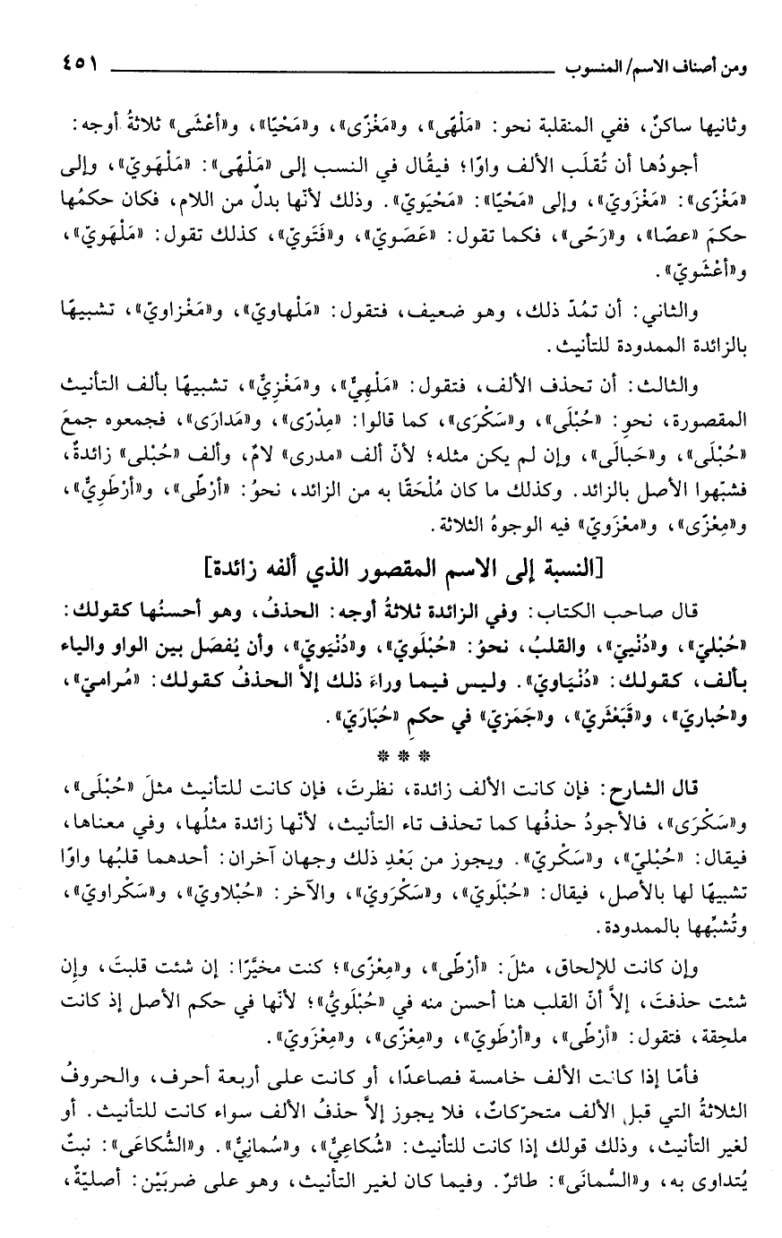 والثالث: أنّ تحذف الألف، فتقول: "مَلْهِيٌّ"، و"مَغْزِيٌّ"، تشبيهًا بألف التأنيث المقصورة، نحوِ: "حُبْلَى"، و"سَكْرَى"، كما قالوا: "مِدْرًى"، و"مَدارَى"، فجمعوه جمعَ "حُبْلَى"، و"حَبالَى"، وإن لم يكن مثله؛ لأنّ ألف "مدرى" لامٌ، وألف "حُبْلى" زائدةٌ، فشبّهوا الأصل بالزائد. وكذلك ما كان مُلْحَقًا به من الزائد، نحوُ: "أرْطًى"، و"أرْطَوِيٌّ"، و"مِغزًى"، و"معْزَويّ" فيه الوجوهُ الثلاثة.
