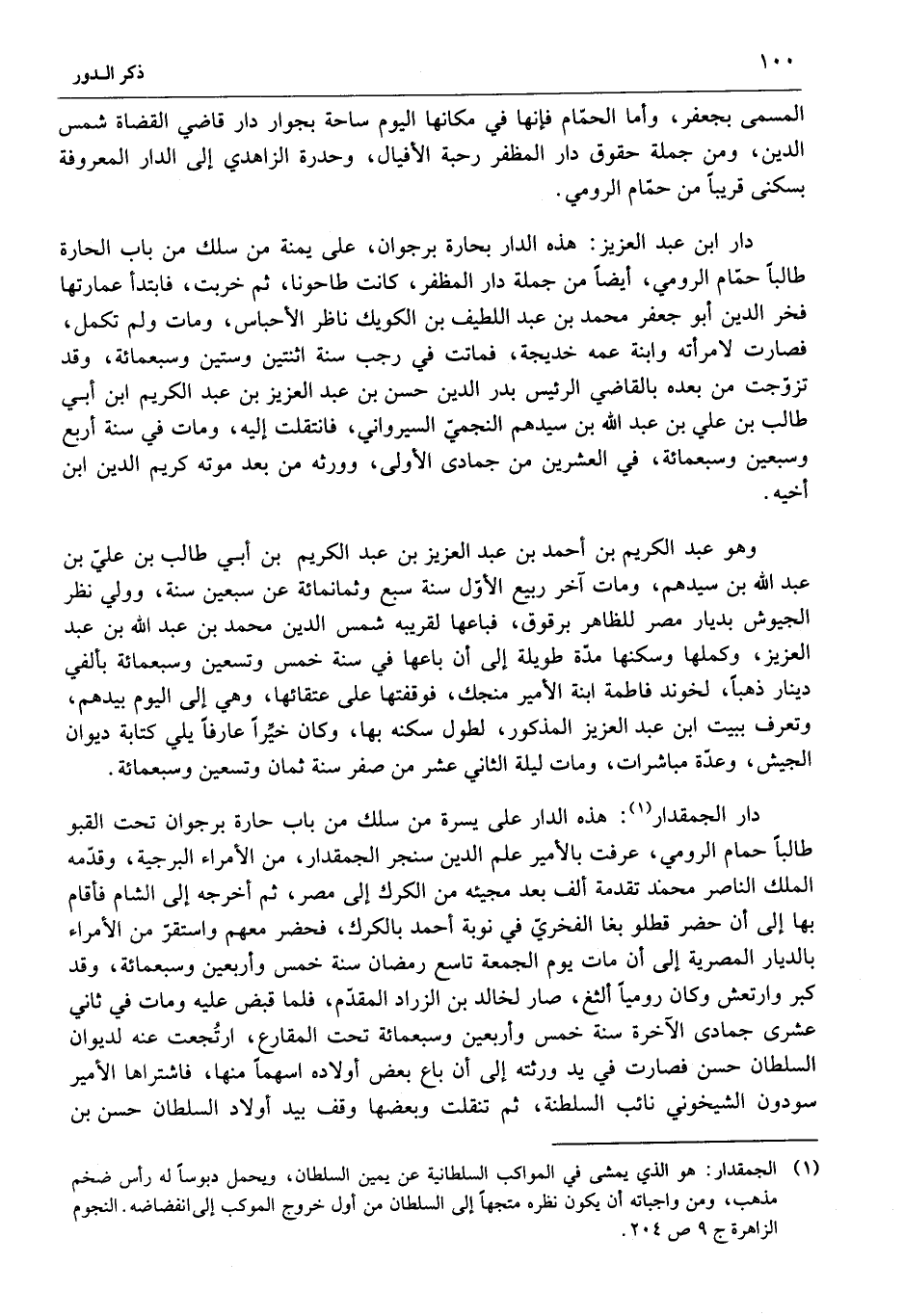 دار الجمقدار «1» : هذه الدار على يسرة من سلك من باب حارة برجوان تحت القبو طالبا حمام الرومي، عرفت بالأمير علم الدين سنجر الجمقدار، من الأمراء البرجية، وقدّمه الملك الناصر محمد تقدمة ألف بعد مجيئه من الكرك إلى مصر، ثم أخرجه إلى الشام فأقام بها إلى أن حضر قطلو بغا الفخريّ في نوبة أحمد بالكرك، فحضر معهم واستقرّ من الأمراء بالديار المصرية إلى أن مات يوم الجمعة تاسع رمضان سنة خمس وأربعين وسبعمائة، وقد كبر وارتعش وكان روميا ألثغ، صار لخالد بن الزراد المقدّم، فلما قبض عليه ومات في ثاني عشرى جمادى الآخرة سنة خمس وأربعين وسبعمائة تحت المقارع، ارتجعت عنه لديوان السلطان حسن فصارت في يد ورثته إلى أن باع بعض أولاده اسهما منها، فاشتراها الأمير سودون الشيخوني نائب السلطنة، ثم تنقلت وبعضها وقف بيد أولاد السلطان حسن بن