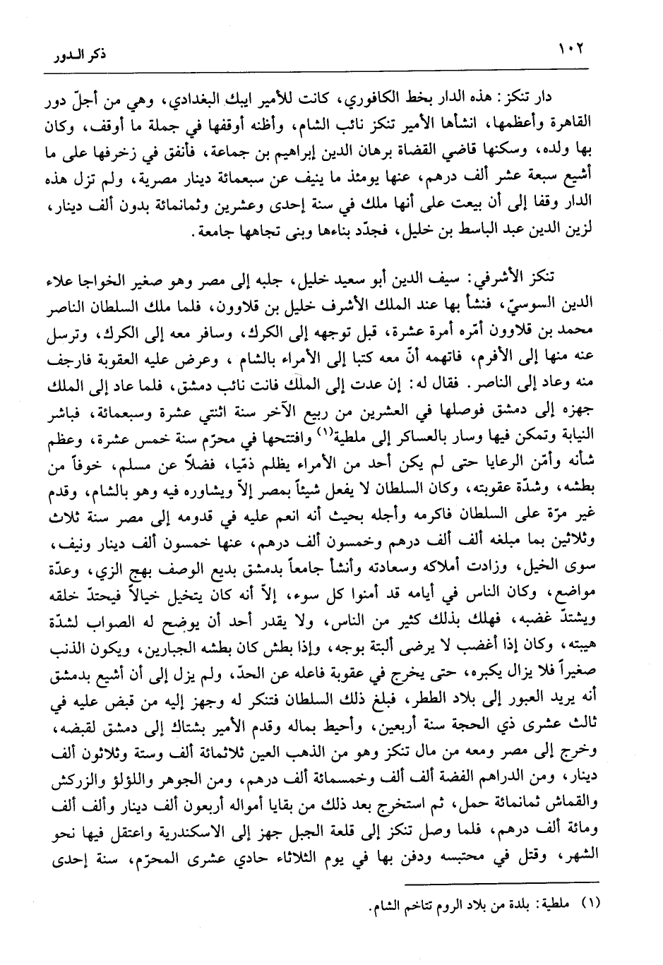 تنكز الأشرفي: سيف الدين أبو سعيد خليل، جلبه إلى مصر وهو صغير الخواجا علاء الدين السوسيّ، فنشأ بها عند الملك الأشرف خليل بن قلاوون، فلما ملك السلطان الناصر محمد بن قلاوون أمّره أمرة عشرة، قبل توجهه إلى الكرك، وسافر معه إلى الكرك، وترسل عنه منها إلى الأفرم، فاتهمه أنّ معه كتبا إلى الأمراء بالشام، وعرض عليه العقوبة فارجف منه وعاد إلى الناصر. فقال له: إن عدت إلى الملك فانت نائب دمشق، فلما عاد إلى الملك جهزه إلى دمشق فوصلها في العشرين من ربيع الآخر سنة اثنتي عشرة وسبعمائة، فباشر النيابة وتمكن فيها وسار بالعساكر إلى ملطية «1» وافتتحها في محرّم سنة خمس عشرة، وعظم شأنه وأمّن الرعايا حتى لم يكن أحد من الأمراء يظلم ذميّا، فضلا عن مسلم، خوفا من بطشه، وشدّة عقوبته، وكان السلطان لا يفعل شيئا بمصر إلّا ويشاوره فيه وهو بالشام، وقدم غير مرّة على السلطان فاكرمه وأجله بحيث أنه انعم عليه في قدومه إلى مصر سنة ثلاث وثلاثين بما مبلغه ألف ألف درهم وخمسون ألف درهم، عنها خمسون ألف دينار ونيف، سوى الخيل، وزادت أملاكه وسعادته وأنشأ جامعا بدمشق بديع الوصف بهج الزي، وعدّة مواضع، وكان الناس في أيامه قد أمنوا كل سوء، إلّا أنه كان يتخيل خيالا فيحتدّ خلقه ويشتدّ غضبه، فهلك بذلك كثير من الناس، ولا يقدر أحد أن يوضح له الصواب لشدّة هيبته، وكان إذا أغضب لا يرضى البتة بوجه، وإذا بطش كان بطشه الجبارين، ويكون الذنب صغيرا فلا يزال يكبره، حتى يخرج في عقوبة فاعله عن الحدّ، ولم يزل إلى أن أشيع بدمشق أنه يريد العبور إلى بلاد الططر، فبلغ ذلك السلطان فتنكر له وجهز إليه من قبض عليه في ثالث عشرى ذي الحجة سنة أربعين، وأحيط بماله وقدم الأمير بشتاك إلى دمشق لقبضه، وخرج إلى مصر ومعه من مال تنكز وهو من الذهب العين ثلاثمائة ألف وستة وثلاثون ألف دينار، ومن الدراهم الفضة ألف ألف وخمسمائة ألف درهم، ومن الجوهر واللؤلؤ والزركش والقماش ثمانمائة حمل، ثم استخرج بعد ذلك من بقايا أمواله أربعون ألف دينار وألف ألف ومائة ألف درهم، فلما وصل تنكز إلى قلعة الجبل جهز إلى الاسكندرية واعتقل فيها نحو الشهر، وقتل في محتبسه ودفن بها في يوم الثلاثاء حادي عشرى المحرّم، سنة إحدى