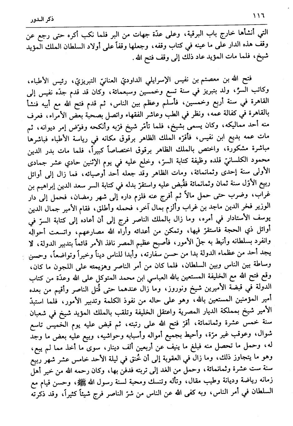 فتح الله بن معتصم بن نفيس الإسرايلي الداوديّ العنانيّ التبريزيّ، رئيس الأطباء، وكاتب السرّ، ولد بتبريز في سنة تسع وخمسين وسبعمائة، وكان قد قدم جدّه نفيس إلى القاهرة في سنة أربع وخمسين، فأسلم وعظم بين الناس، ثم قدم فتح الله مع أبيه فنشأ بالقاهرة في كفالة عمه، ونظر في الطب وعاشر الفقهاء واتصل بصحبة بعض الأمراء، فعرف منه أحد مماليكه، وكان يسمى بشيخ، فلما تأمّر شيخ فرّبه وأنكحه وفوّض إمر ديوانه، ثم مات عمه بديع ابن نفيس، فأقرّه الملك الظاهر برقوق مكانه في رياسة الأطباء فباشرها مباشرة مشكورة، واختص بالملك الظاهر برقوق اختصاصا كبيرا، فلما مات بدر الدين محمود الكلسانيّ قلده وظيفة كتابة السرّ، وخلع عليه في يوم الاثنين حادي عشر جمادى الأولى سنة إحدى وثمانمائة، ومات الظاهر وقد جعله أحد أوصيائه، فما زال إلى أوائل ربيع الأوّل سنة ثمان وثمانمائة فقبض عليه واستقرّ بدله في كتابة السر سعد الدين إبراهيم بن غراب، وضرب حتى حمل مالا ثم أفرج عنه فلزم داره إلى شهر رمضان، فحمل إلى دار الوزير فخر الدين ماجد بن غراب وألزم بمال آخر، فحمله وأطلق، فقام الأمير جمال الدين يوسف الأستادار في أمره، وما زال بالملك الناصر فرج إلى أن أعاده إلى كتابة السرّ في أوائل ذي الحجة فاستقرّ فيها، وتمكن من أعدائه وأراه الله مصارعهم، واتسعت أحواله وانفرد بسلطانه وأنيط به جلّ الأمور، فأصبح عظيم المصر نافذ الأمر قائما بتدبير الدولة، لا يجد أحد من عظماء الدولة بدا من حسن سفارته، وأبدا للناس دينا وخيرا وتواضعا، وحسن وساطة بين الناس وبين السلطان، فلما كان من أمر الناصر وهزيمته على اللجون ما كان، وقع فتح الله مع الخليفة المستعين بالله العباسي ابن محمد المتوكل على الله وعدّة من كتاب الدولة في قبضة الأميرين شيخ ونوروز، وما زال عند هما حتى قتل الناصر وأقيم من بعده أمير المؤمنين المستعين بالله، وهو على حاله من نفوذ الكلمة وتدبير الأمور، فلما استبدّ الأمير شيخ بمملكة الديار المصرية واعتقل الخليفة وتلقب بالملك المؤيد شيخ في شعبان سنة خمس عشرة وثمانمائة، أقرّ فتح الله على رتبته، ثم قبض عليه يوم الخميس تاسع شوال، وعوقب غير مرّة، وأحيط بجميع أمواله وأسبابه وحواشيه، وبيع عليه بعض ما وجد له، وحمل ما تحصل منه فبلغ ما ينيف عن أربعين ألف دينار، سوى ما أخذ مما لم يبع، وهو ما يتجاوز ذلك، وما زال في العقوبة إلى أن خنق في ليلة الأحد خامس عشر شهر ربيع سنة ست عشرة وثمانمائة، وحمل من الغد إلى تربته فدفن بها، وكان رحمه الله من خير أهل زمانه رياضة وديانة وطيب مقال، وتأله وتنسك ومحبة لسنة رسول الله صلى الله عليه وسلم، وحسن قيام مع السلطان في أمر الناس، وبه كفى الله عن الناس من شرّ الناصر فرج شيئا كثيرا، وقد ذكرته