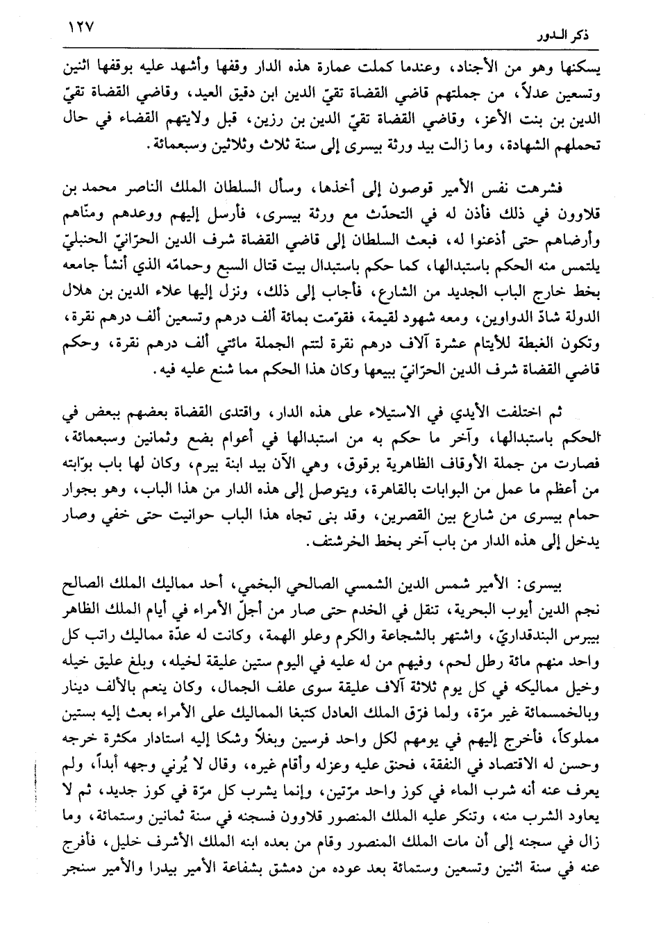 يسكنها وهو من الأجناد، وعند ما كملت عمارة هذه الدار وقفها وأشهد عليه بوقفها اثنين وتسعين عدلا، من جملتهم قاضي القضاة تقيّ الدين ابن دقيق العيد، وقاضي القضاة تقيّ الدين بن بنت الأعز، وقاضي القضاة تقيّ الدين بن رزين، قبل ولايتهم القضاء في حال تحملهم الشهادة، وما زالت بيد ورثة بيسرى إلى سنة ثلاث وثلاثين وسبعمائة.
