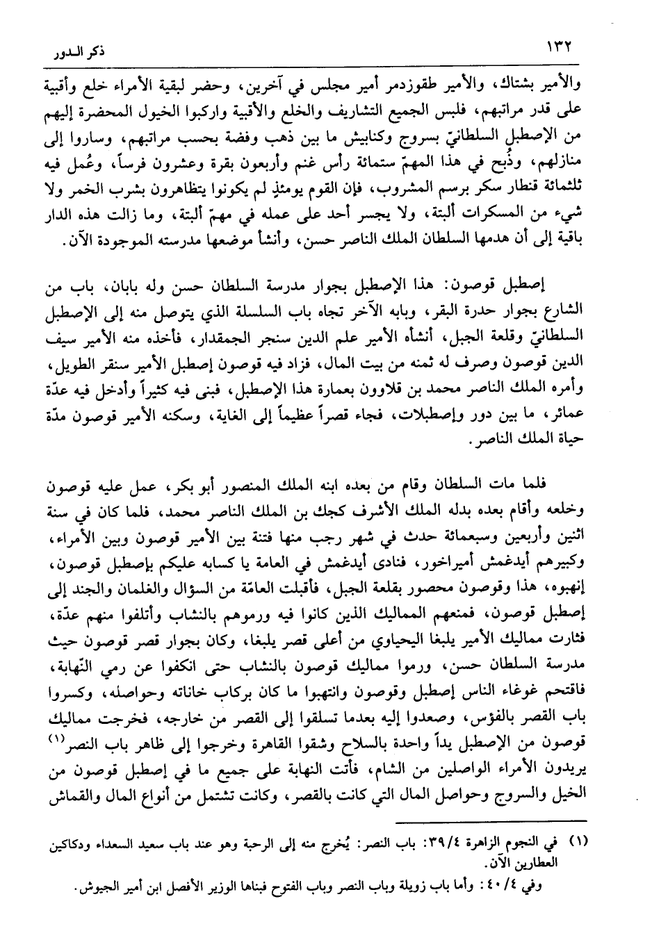 إصطبل قوصون: هذا الإصطبل بجوار مدرسة السلطان حسن وله بابان، باب من الشارع بجوار حدرة البقر، وبابه الآخر تجاه باب السلسلة الذي يتوصل منه إلى الإصطبل السلطانيّ وقلعة الجبل، أنشأه الأمير علم الدين سنجر الجمقدار، فأخذه منه الأمير سيف الدين قوصون وصرف له ثمنه من بيت المال، فزاد فيه قوصون إصطبل الأمير سنقر الطويل، وأمره الملك الناصر محمد بن قلاوون بعمارة هذا الإصطبل، فبنى فيه كثيرا وأدخل فيه عدّة عمائر، ما بين دور وإصطبلات، فجاء قصرا عظيما إلى الغاية، وسكنه الأمير قوصون مدّة حياة الملك الناصر.