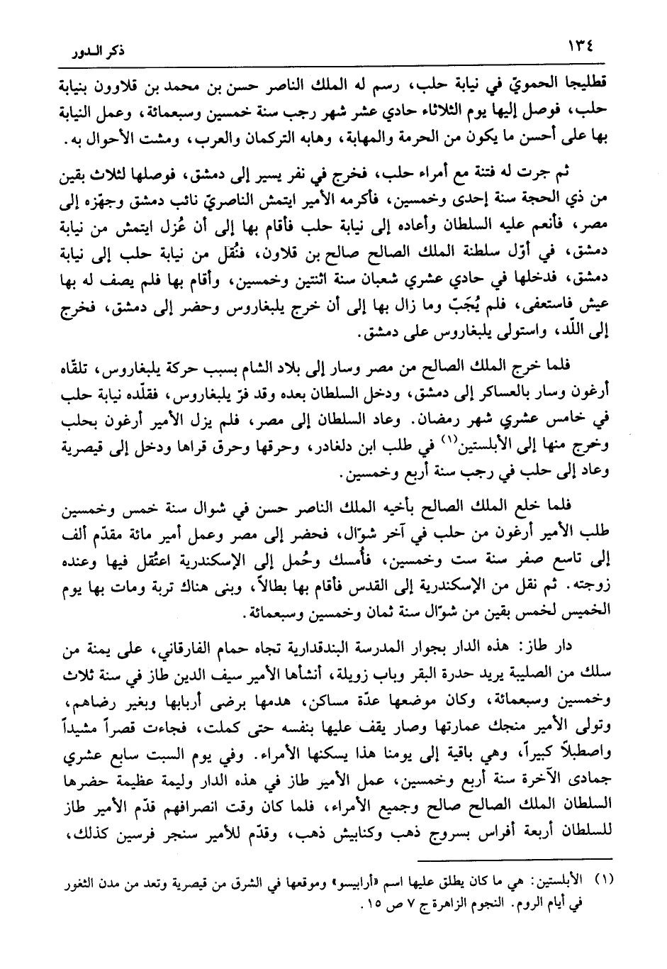 فلما خرج الملك الصالح من مصر وسار إلى بلاد الشام بسبب حركة يلبغاروس، تلقّاه أرغون وسار بالعساكر إلى دمشق، ودخل السلطان بعده وقد فرّ يلبغاروس، فقلّده نيابة حلب في خامس عشري شهر رمضان. وعاد السلطان إلى مصر، فلم يزل الأمير أرغون بحلب وخرج منها إلى الأبلستين «1» في طلب ابن دلغادر، وحرقها وحرق قراها ودخل إلى قيصرية وعاد إلى حلب في رجب سنة أربع وخمسين.