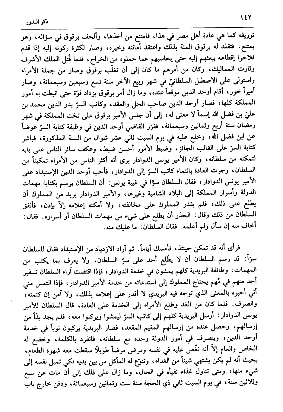 فرأى أنه قد تمكن حينئذ، فأمسك أياما. ثم أراد الازدياد من الاستبداد فقال للسلطان سرّا: قد رسم السلطان أن لا يطّلع أحد على سرّ السلطان، ولا يعرف بما يكتب من المهمات، وطائفة البريدية كلهم يمشون في خدمة الدوادار، فإذا اقتضت آراء السلطان تسفير أحد منهم في مهم يحتاج المملوك إلى استدعائه من خدمة الأمير الدوادار، فإذا التمس مني أني أخبره بالمعنى الذي توجه فيه البريدي لا أقدر على إعلامه بذلك، ولا آمن إن كتمته، وانصرف. فلما كان من الغد وطلع الأمراء إلى الخدمة على العادة، قال السلطان للأمير يونس الدوادار: أرسل البريدية كلهم إلى كاتب السرّ ليمشوا ويركبوا معه، فلم يجد بدّا من إرسالهم، وحصل عنده من إرسالهم المقيم المقعد، فصار البريدية يركبون نوبا في خدمة أوحد الدين، ويتصرف في أمور الدولة وحده مع سلطانه، فانفرد بالكلمة، وخضع له الخاص والعام إلّا أنه نغّص عليه في نفسه ومرض مرضا طويلا سقطت معه شهوة الطعام، بحيث أنه لم يكن يشتهي شيئا من الغداء، وتنوّع له المأكل من بين يديه لكي تميل نفسه إلى شيء منها، ومتى تناول غذاء تقيأه في الحال، وما زال على ذلك إلى أن مات عن سبع وثلاثين سنة، في يوم السبت ثاني ذي الحجة سنة ست وثمانين وسبعمائة، ودفن خارج باب