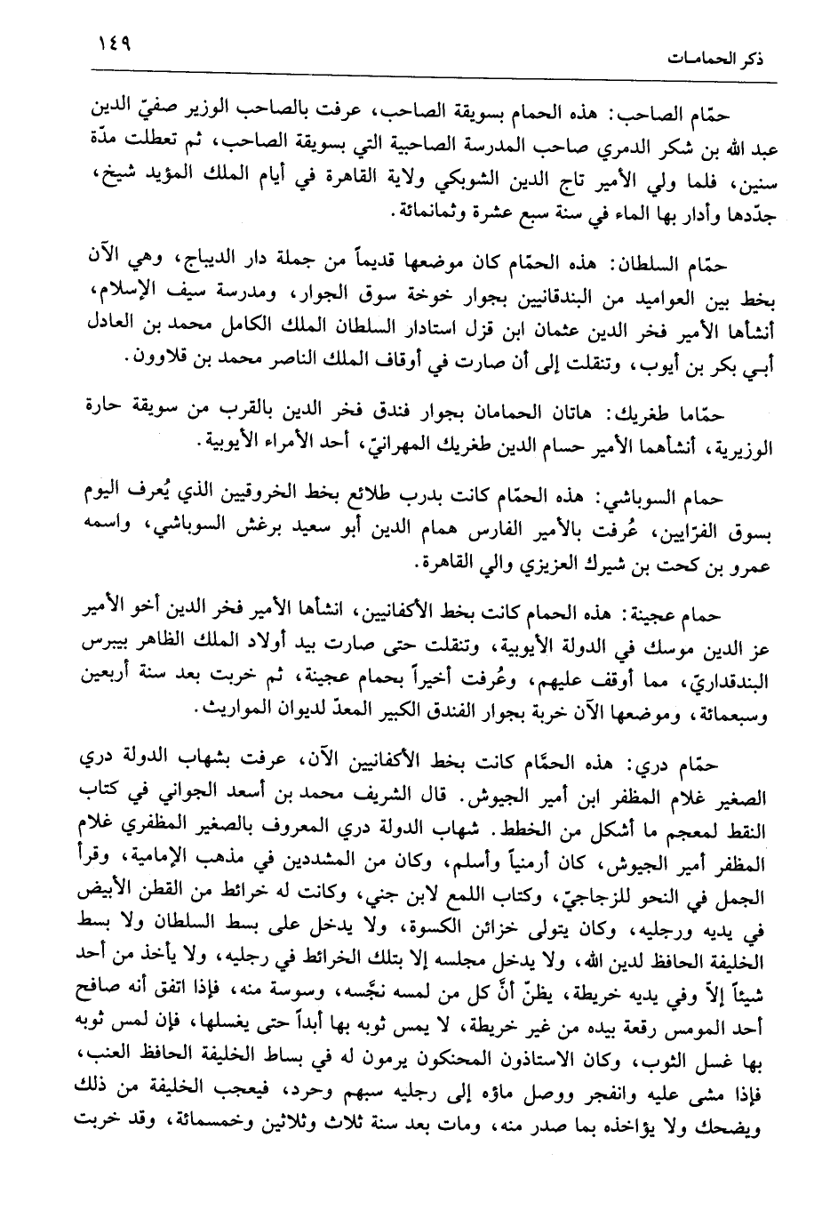 حمّام دري: هذه الحمّام كانت بخط الأكفانيين الآن، عرفت بشهاب الدولة دري الصغير غلام المظفر ابن أمير الجيوش. قال الشريف محمد بن أسعد الجواني في كتاب النقط لمعجم ما أشكل من الخطط. شهاب الدولة دري المعروف بالصغير المظفري غلام المظفر أمير الجيوش، كان أرمنيا وأسلم، وكان من المشددين في مذهب الإمامية، وقرأ الجمل في النحو للزجاجيّ، وكتاب اللمع لابن جني، وكانت له خرائط من القطن الأبيض في يديه ورجليه، وكان يتولى خزائن الكسوة، ولا يدخل على بسط السلطان ولا بسط الخليفة الحافظ لدين الله، ولا يدخل مجلسه إلا بتلك الخرائط في رجليه، ولا يأخذ من أحد شيئا إلّا وفي يديه خريطة، يظنّ أنّ كل من لمسه نجّسه، وسوسة منه، فإذا اتفق أنه صافح أحد المومس رقعة بيده من غير خريطة، لا يمس ثوبه بها أبدا حتى يغسلها، فإن لمس ثوبه بها غسل الثوب، وكان الاستاذون المحنكون يرمون له في بساط الخليفة الحافظ العنب، فإذا مشى عليه وانفجر ووصل ماؤه إلى رجليه سبهم وحرد، فيعجب الخليفة من ذلك ويضحك ولا يؤاخذه بما صدر منه، ومات بعد سنة ثلاث وثلاثين وخمسمائة، وقد خربت