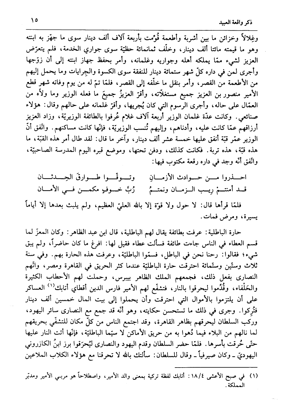 وغلالا وخزائن ما بين أشربة وأطعمة قوّمت بأربعة آلاف ألف دينار سوى ما جهّز به ابنته وهو ما قيمته مائتا ألف دينار، وخلّف ثمانمائة حظيّة سوى جواري الخدمة، فلم يتعرّض العزيز لشيء ممّا يملكه أهله وجواريه وغلمانه، وأمر بحفظ جهاز ابنته إلى أن زوّجها وأجرى لمن في داره كلّ شهر ستمائة دينار للنفقة سوى الكسوة والجرايات وما يحمل إليهم من الأطعمة من القصر، وأمر بنقل ما خلّفه إلى القصر، فلمّا تمّ له من يوم وفاته شهر قطع الأمير منصور بن العزيز جميع مستغلّاته، وأقرّ العزيز جميع ما فعله الوزير وما ولّاه من العمّال على حاله، وأجرى الرسوم التي كان يجريها، وأقرّ غلمانه على حالهم وقال: هؤلاء صنائعي. وكانت عدّة غلمان الوزير أربعة آلاف غلام عرفوا بالطائفة الوزيريّة، وزاد العزيز أرزاقهم عمّا كانت عليه، وأدناهم، وإليهم تنسب الوزيريّة، فإنّها كانت مساكنهم. واتّفق أنّ الوزير عمّر قبّة أنفق عليها خمسة عشر ألف دينار، وآخر ما قال: لقد طال أمر هذه القبّة، ما هذه قبّة، هذه تربة. فكانت كذلك، ودفن تحتها، وموضع قبره اليوم المدرسة الصاحبيّة، واتّفق أنّه وجد في داره رقعة مكتوب فيها: