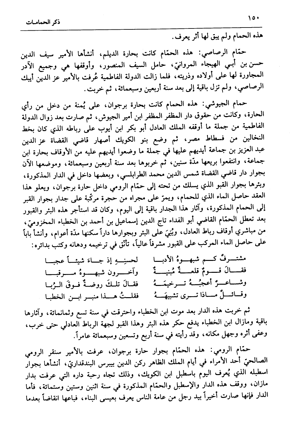 حمام الجيوشي: هذه الحمام كانت بحارة برجوان، على يمنة من دخل من رأي الحارة، وكانت من حقوق دار المظفر المظفر ابن أمير الجيوش، ثم صارت بعد زوال الدولة الفاطمية من جملة ما أوقفه الملك العادل أبو بكر ابن أيوب على رباطه الذي كان بخط النخالين من فسطاط مصر، ثم وضع بنو الكويك أصهار قاضي القضاة عز الدين عبد العزيز بن جماعة أيديهم عليها في جملة ما وضعوا أيديهم عليه من الأوقاف بحارة ابن جماعة، وانتفعوا بريعها مدّة سنين، ثم خربوها بعد سنة أربعين وسبعمائة، وموضعها الآن بجوار دار قاضي القضاة شمس الدين محمد الطرابلسي، وبعضها داخل في الدار المذكورة، وبئرها بجوار القبو الذي يسلك من تحته إلى حمّام الرومي داخل حارة برجوان، ويعلو هذا العقد حاصل الماء الذي للحمام، ويمرّ على مجراه من حجرة مركّبة على جدار بجوار القبر إلى الحمام المذكورة، وآثار هذا الجدار باقية إلى اليوم، وكان قد استأجر هذه البئر والقبور بعد تعطل الحمّام القاضي أبو الفداء تاج الدين إسماعيل بن أحمد بن الخطباء المخزوميّ، من مباشري أوقاف رباط العادل، وبني على البئر وبجوارها دارا سكنها مدّة أعوام، وأنشأ بابا على حاصل الماء المركب على القبور مشرفا عاليا، تأنّق في ترخيمه ودهانه وكتب بدائره: