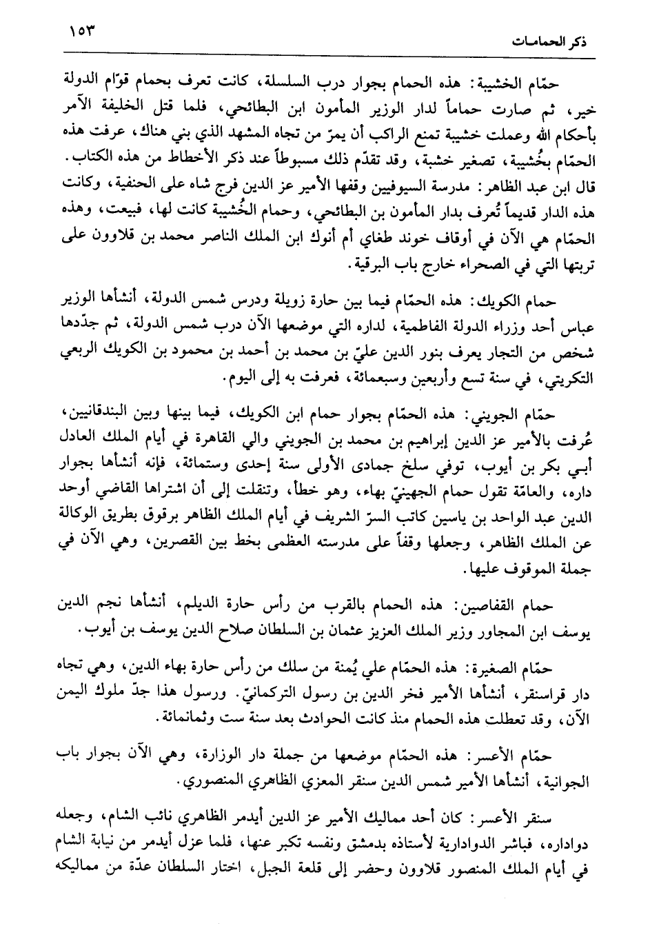 حمّام الجويني: هذه الحمّام بجوار حمام ابن الكويك، فيما بينها وبين البندقانيين، عرفت بالأمير عز الدين إبراهيم بن محمد بن الجويني والي القاهرة في أيام الملك العادل أبي بكر بن أيوب، توفي سلخ جمادى الأولى سنة إحدى وستمائة، فإنه أنشأها بجوار داره، والعامّة تقول حمام الجهينيّ بهاء، وهو خطأ، وتنقلت إلى أن اشتراها القاضي أوحد الدين عبد الواحد بن ياسين كاتب السرّ الشريف في أيام الملك الظاهر برقوق بطريق الوكالة عن الملك الظاهر، وجعلها وقفا على مدرسته العظمى بخط بين القصرين، وهي الآن في جملة الموقوف عليها.